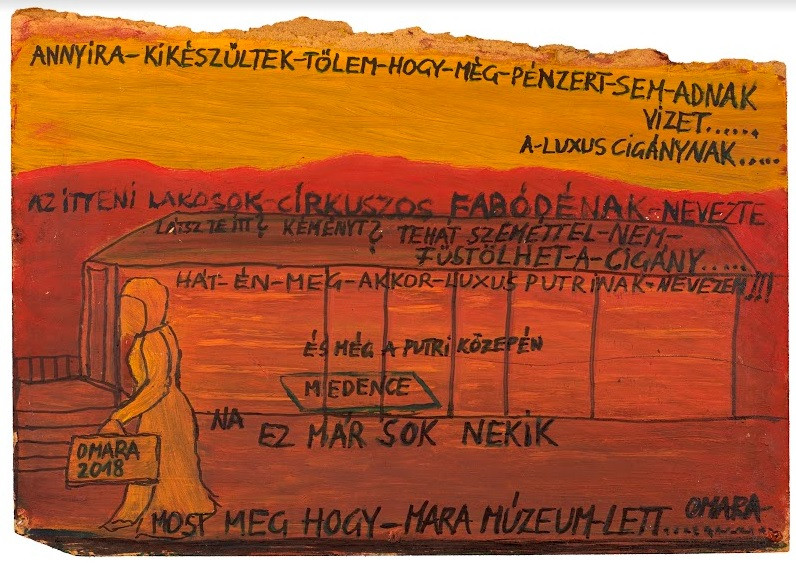 We can understand the paintings on display by OMARA – Mara Oláh to be her responses to racism and expressions of her anger. Oláh makes it clear that she will not ignore her anger; she will not be silent about it either. As the African American poet Audre Lorde wrote regarding racism and anger: “My fear of that anger taught me nothing. Your fear of that anger will teach you nothing, also.” How can we come to terms with anger? How can we exist with anger? How can we listen to anger? Mara Oláh was a self-taught artist who started to paint in her forties. Her paintings and drawings usually represent real occurrences and include poetic inscriptions to highlight her emotional state. She used art to come to terms with the traumas of her life as well as the difficulties resulting from her position as a Romani woman in Hungary.