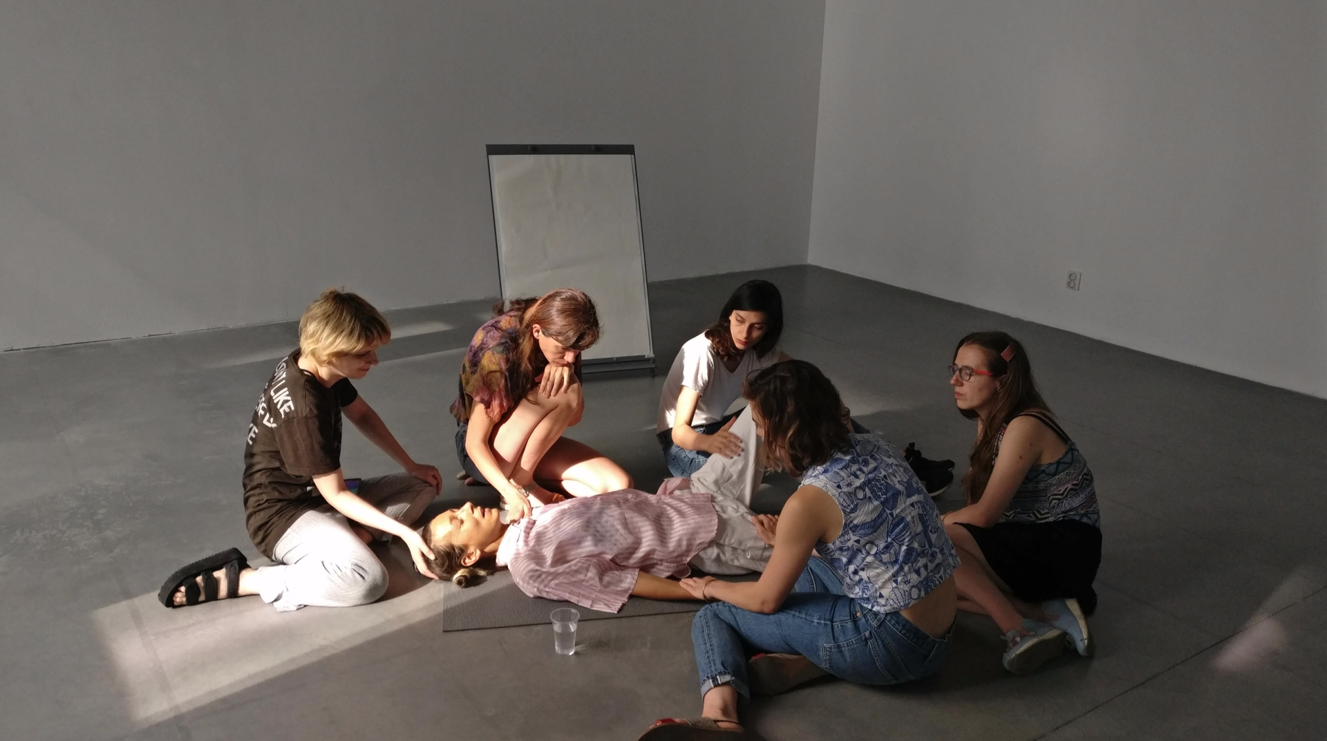 In its iteration in the Biennale, You Are is presented as a document: objects that the artist commonly utilizes in her performance and the video documentation that recorded her execution of a performance. It uses the idea of a space—social and affective—that can accommodate forms of therapy, of performance, and abstract thinking. For example, the white cube is a therapy room or a lecture hall, where contemplation meets abstraction and therapeutic touch meets conceptual distance. In this post-hospice scenario, the visitor-performer is always (a) patient, awaiting the therapeutic touch of a collective.