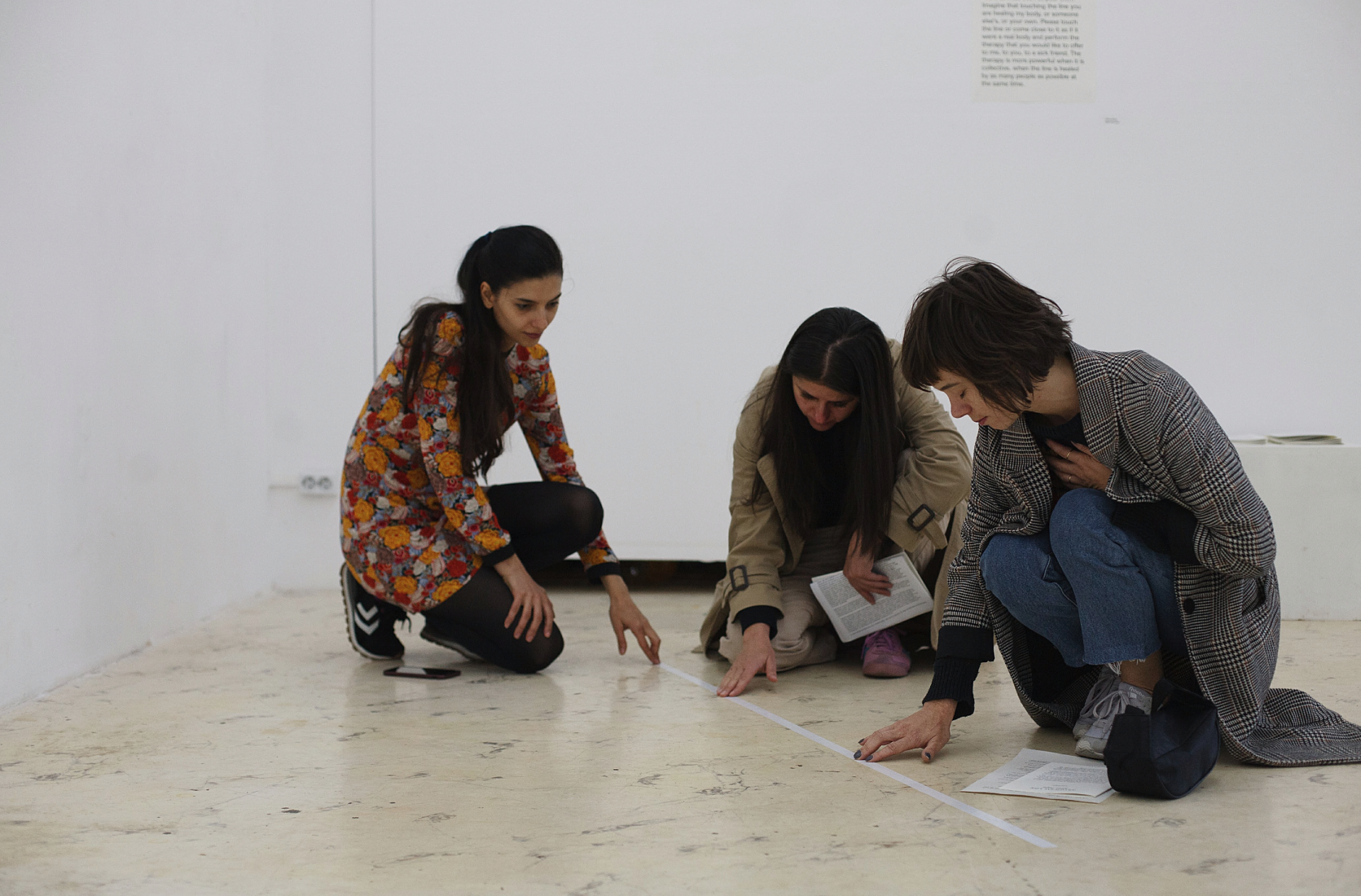 In Heal the Line, a line is drawn on the floor to the measure of the artist’s height. Visitors can touch the line that will also heal it. Overlapping this post-therapeutic condition is Unexperiences, another process of Artworlds in the framework of Black Hyperbox. Unlike the coincidence between the line and another body in Popa’s work, bodies are present in Unexperiences as they are inserted like waves in “inappropriate” contexts where another system of attitudes and behaviors is already taking place. Both affect-oriented incidences transmit art-making and life-making in the most unreasonable, alienating gaps between concept and experience.