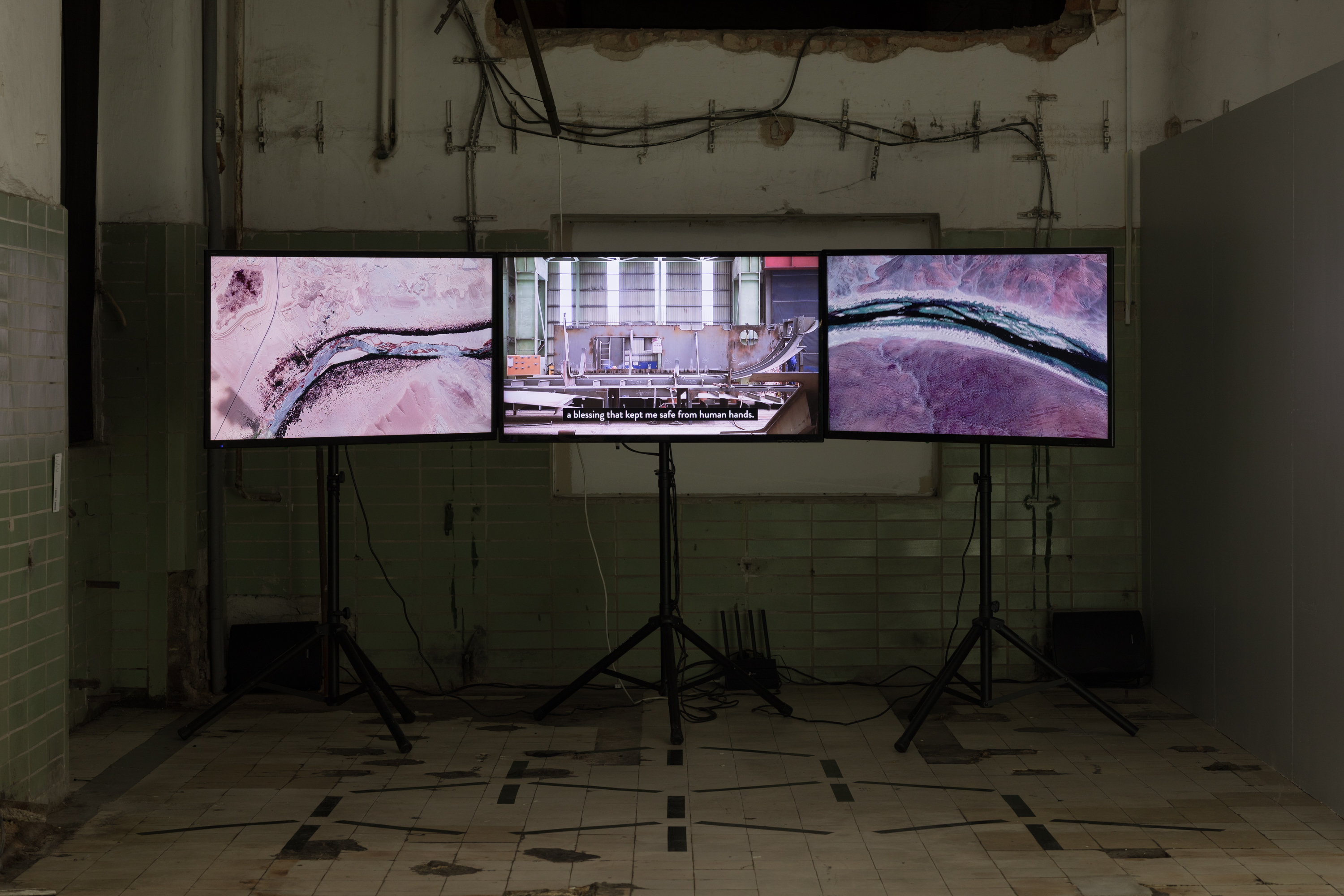 Anca Benera and Arnold Estefán are artists who have been working together since 2011. Their work in installation, video, and performance uses research-based methodologies to reveal the invisible patterns that lie behind historical, social, or geopolitical narratives. Their recent work investigates the phenomenon of man-made landscapes around the world, where the making and marking of the landscape goes hand in hand with a heightened state of violence and the overexploitation of resources. The artists’ three-channel video installation juxtaposes three distinct geographies—the Namibian desert, the adjacent Atlantic Ocean, and the Romanian Black Sea coast—and industries interconnected by opaque trading networks which share a common mineral: the diamond. The history of diamond mining in Namibia, then part of colonial German Southwest Africa, began in 1908, and as the land’s resources are slowly being depleted, the ocean has become the next mining frontier. Some of the highest-quality gems are thus mined from the igneous rock, known as the blue ground, off the Namibian coast. Hence the scars of the Namibian desert landscape find their counterpart in the welded seams of the first custom-made diamond recovery vessel, commissioned by De Beers Group in a joint venture with the Namibian government, constructed in a Romanian shipyard in 2021.
