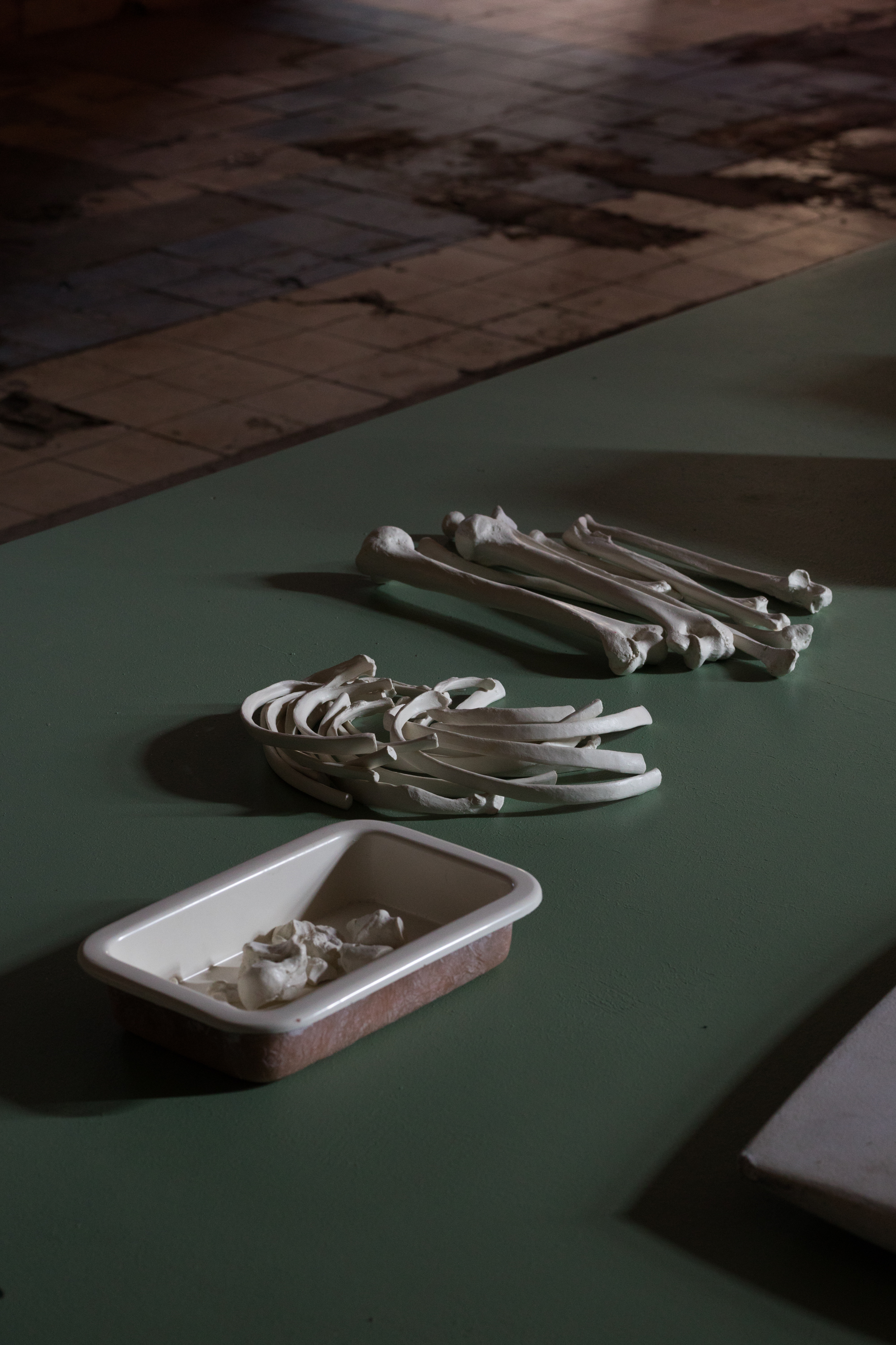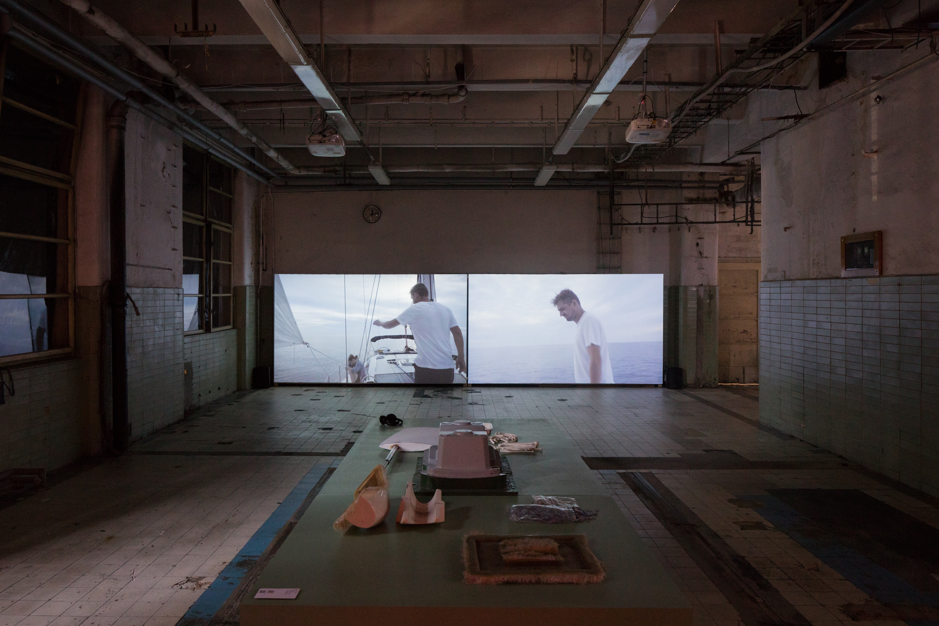 In the installation accompanying the videos, we are surrounded by bits and pieces resembling debris. They look like traces of a catastrophe, clues supposedly leading us to a solution for the undefined case. The question that remains is where are the people who did not make it to the boat?