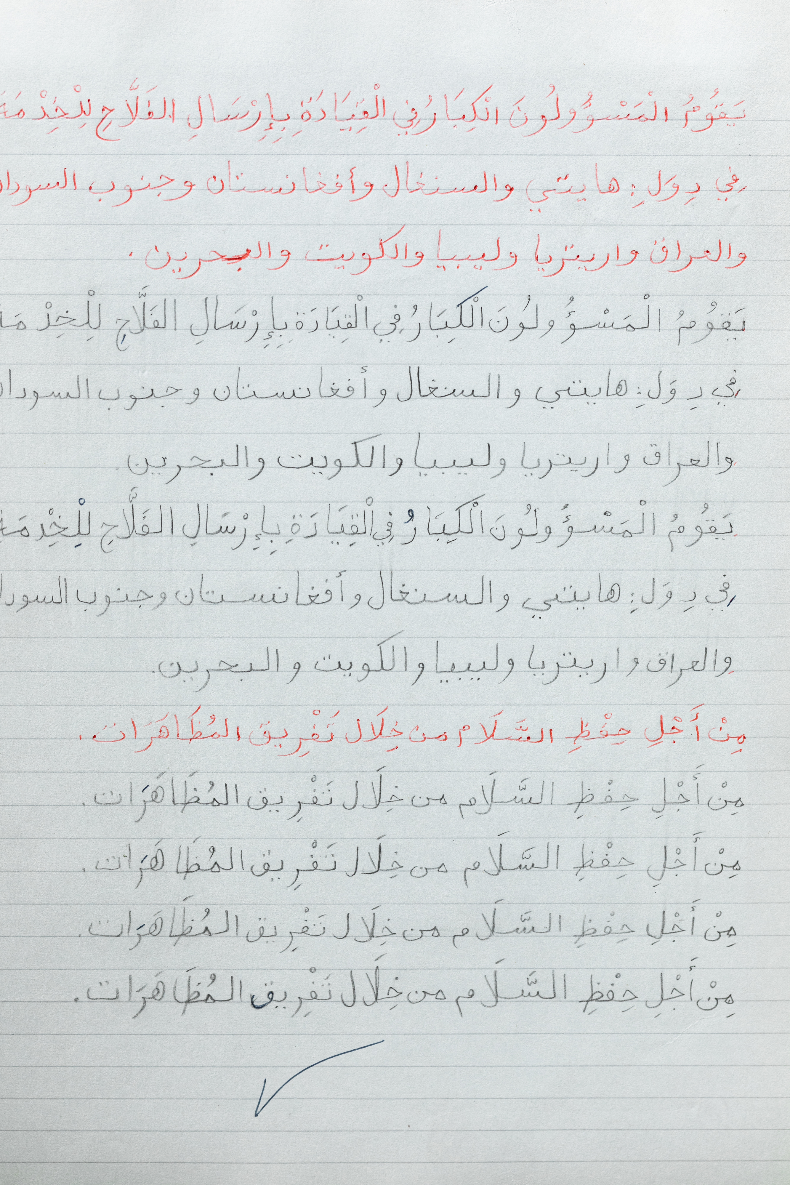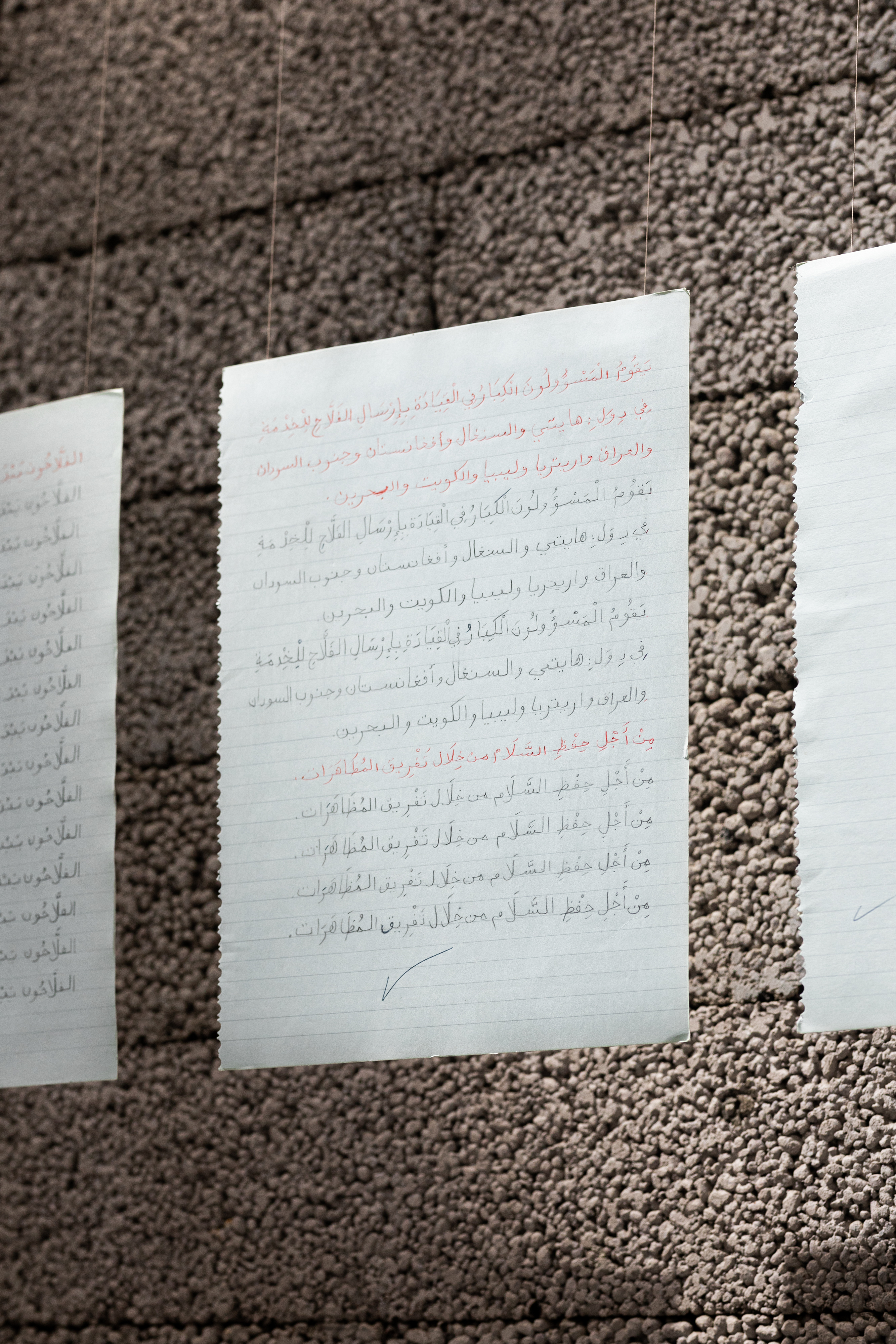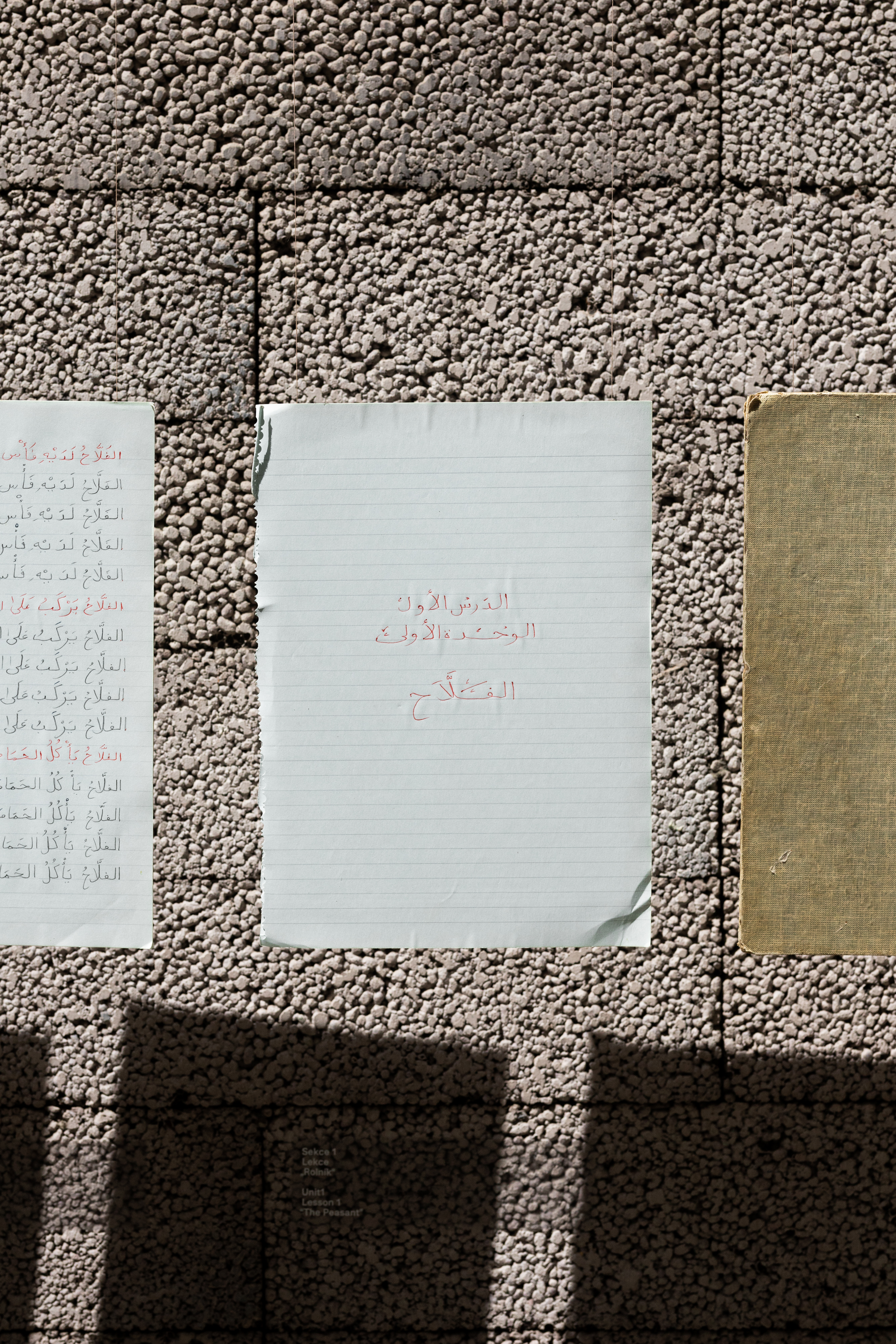 She also collaborates with the Czech artist and researcher Tomáš Uhnák on his new project for the biennale. Together they create a local adaptation of her ongoing work Peasant CV, focusing on the situation of small farmers in the Czech Republic. El Fellah Ando Fes [The Peasant Has a Hoe] talks about how the work of peasants has changed in Jordan. Asunción found out that the small farmer is often used as an example in Arabic calligraphy and grammar exercises that children learn at school. However, these sentences describe how peasants worked in the past and make their situation look better than it really is. The peasant eats roast pigeon. So Asunción decided to create new exercises that show the problems farmers face today: Irrigation water gets privatized. The fertile soil starts to turn into desert. The peasant does not want his children to become farmers. The sentences are handwritten on lined paper resembling a school notebook. With this Asunción reminds us that there is still a lot we can learn about the situation of today’s farmers.