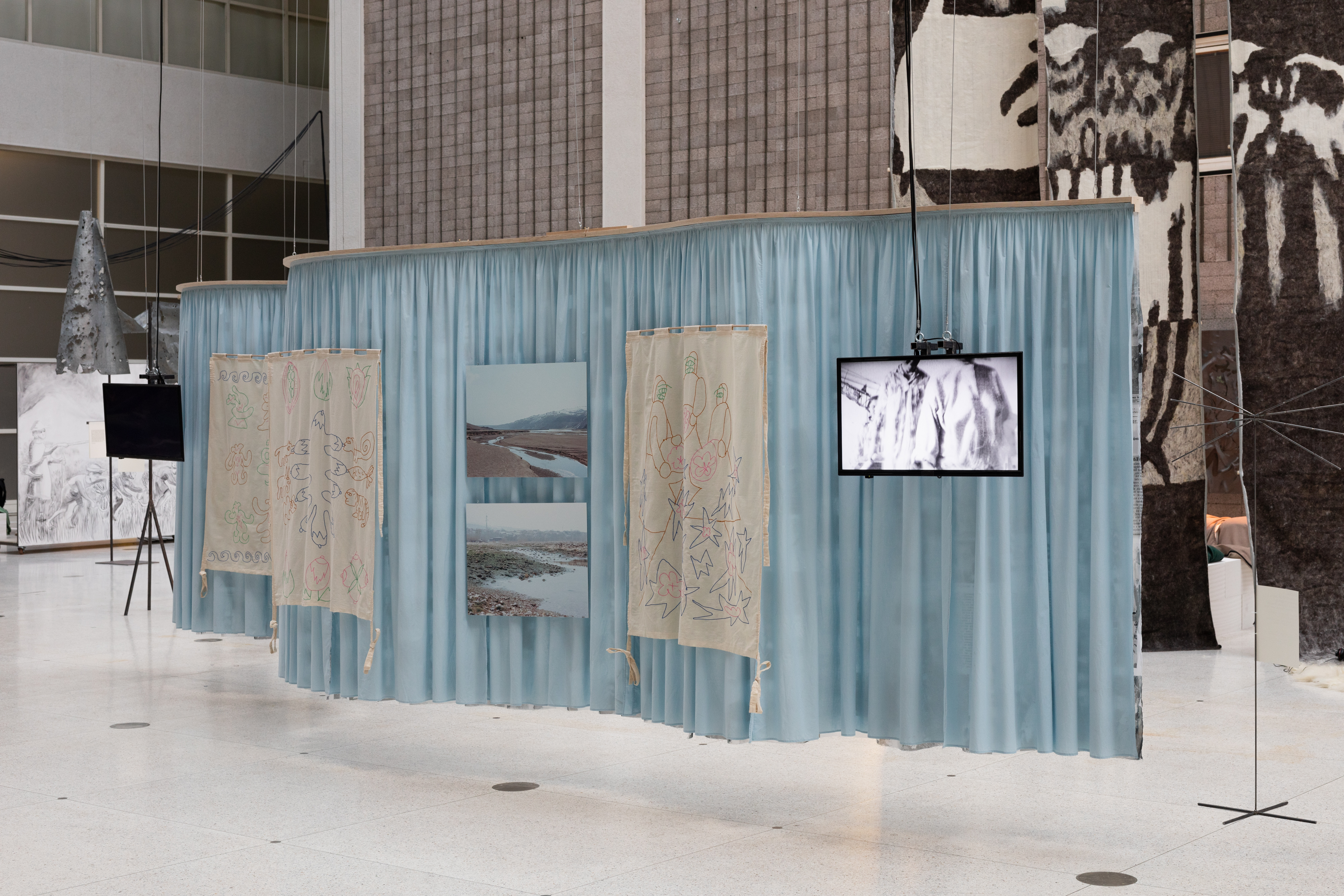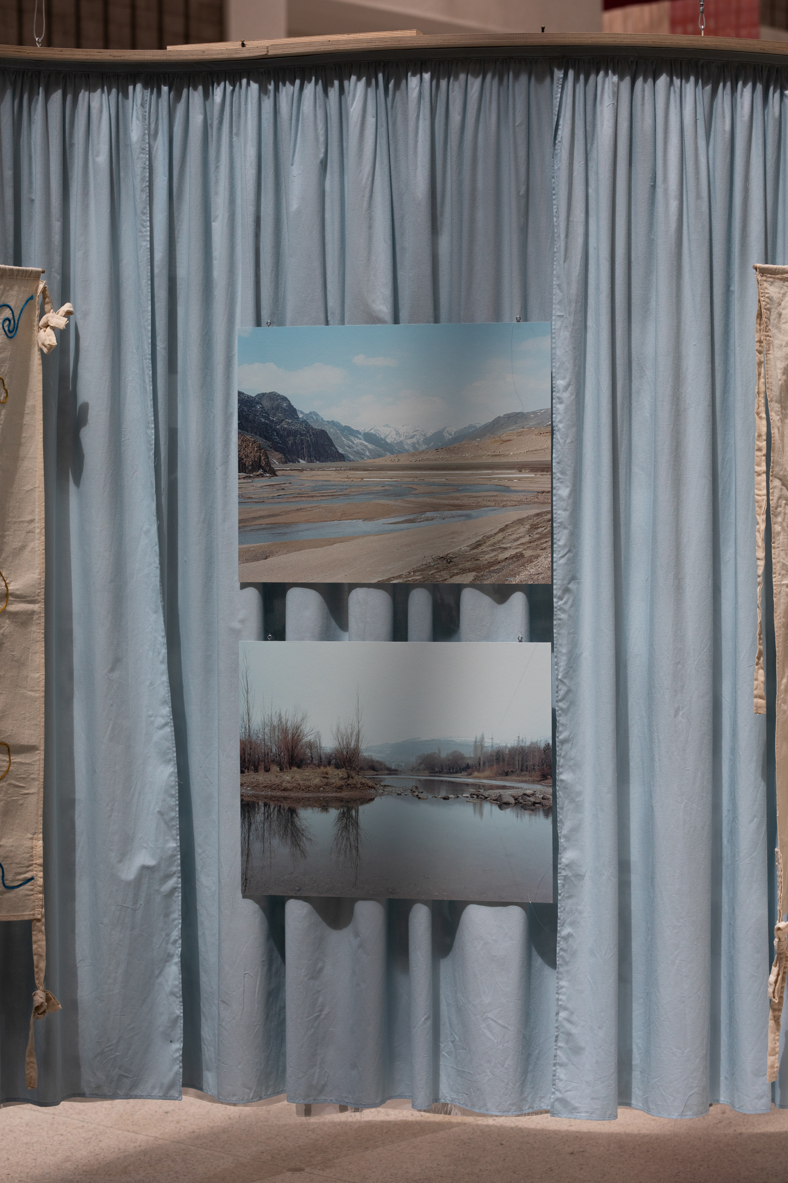 Taming Women and Waters in Soviet Central Asia / 2024 / research-based multimedia installation / archival films (8 min), archival work (collage, print on fabric, 200 × 700 cm), photography series (each print 60 × 48 cm), textile works (embroidery, each 94 × 119 cm) / courtesy of the artists