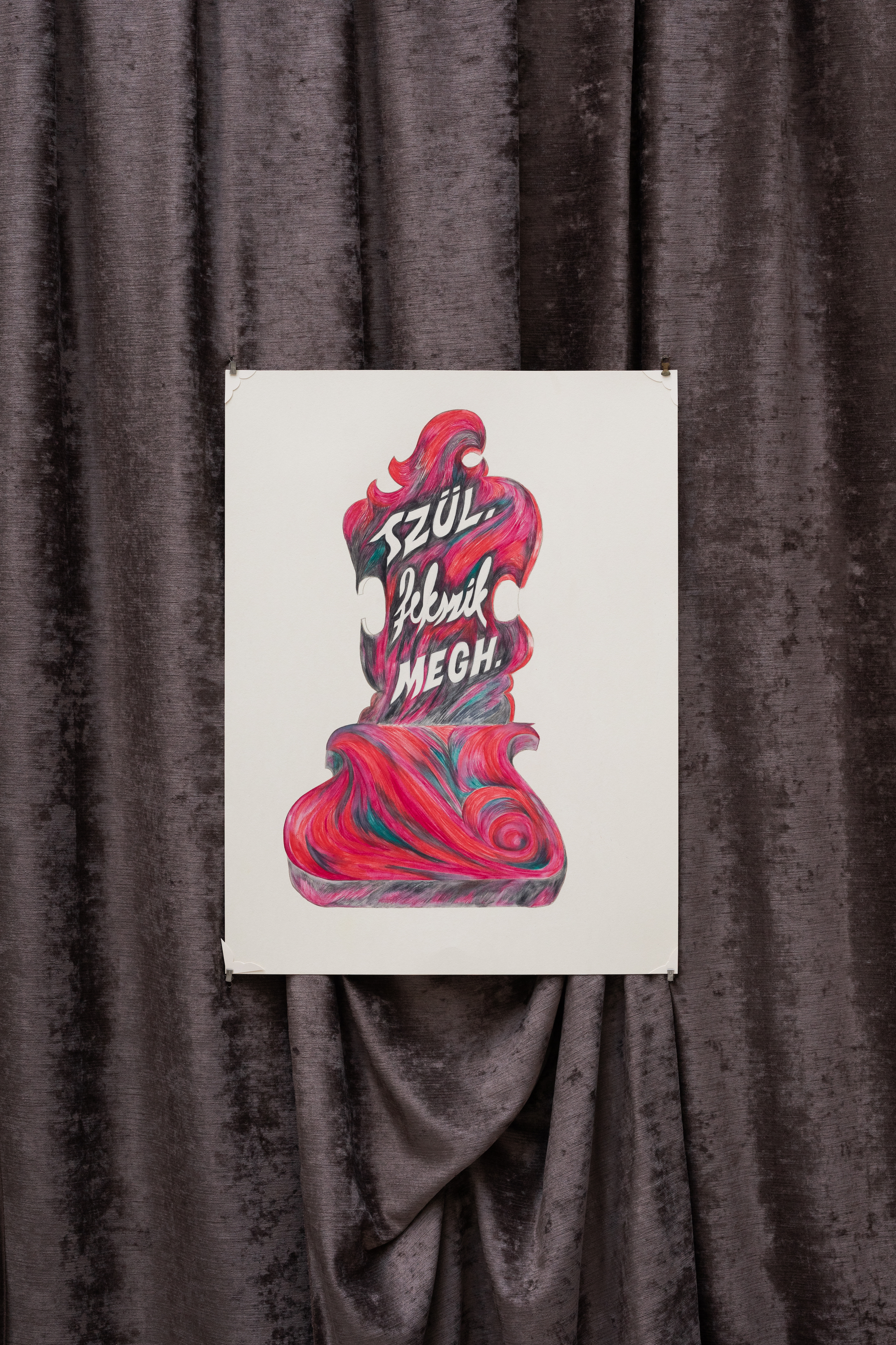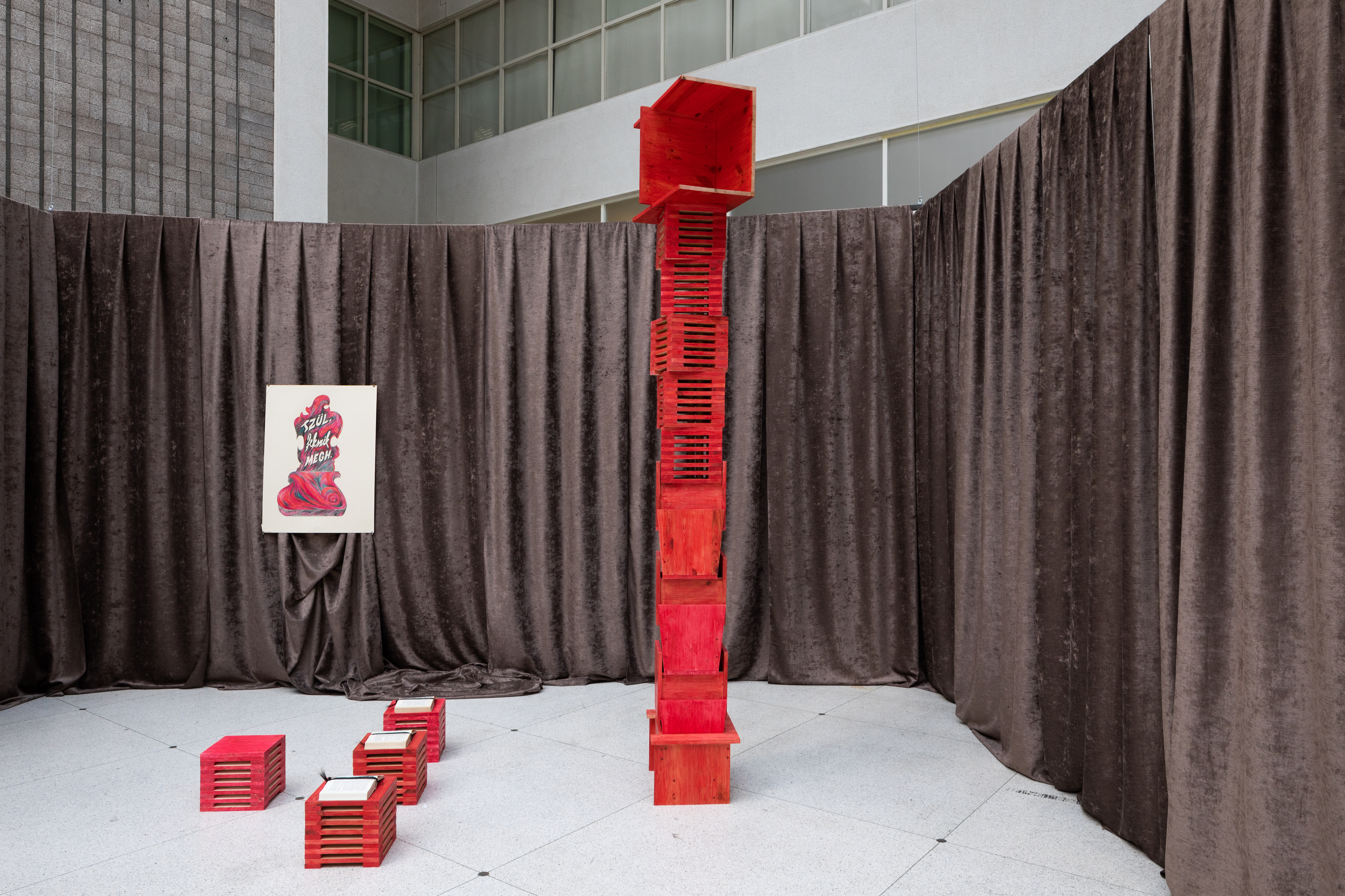 “Lay Him Not Upon Me...” – The Body of a Peasant Woman / 2020 / multimedia installation / audio (8 min 47 s), sculpture, painting (watercolor crayon, paper, 75 x 100 cm), drawing (watercolor pencil, paper, 70 x 85 cm), book, curtain / sculpture designed in collaboration with AU Workshop and Creature Furniture / courtesy of the artist and Horváth Művészeti Alapítvány
