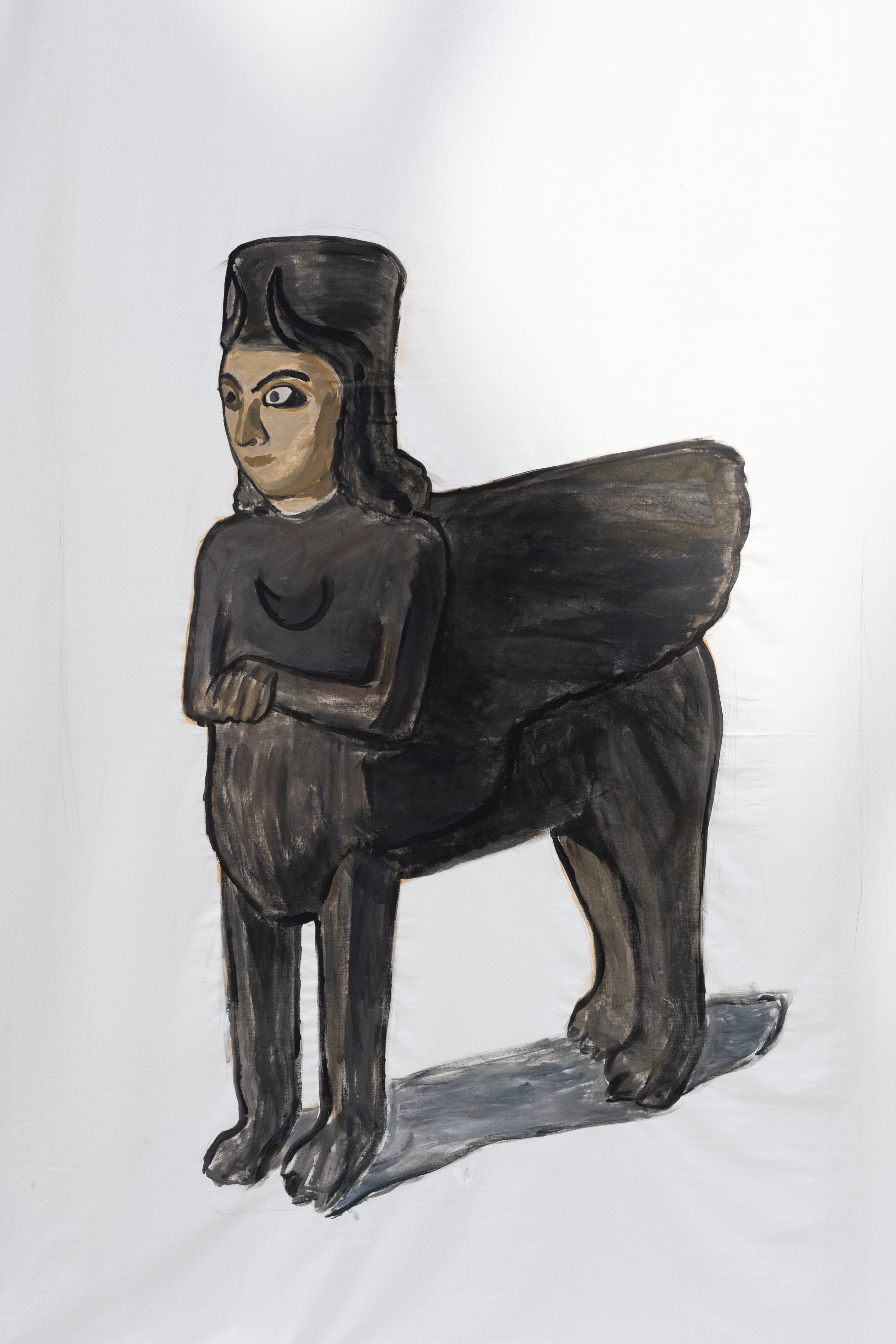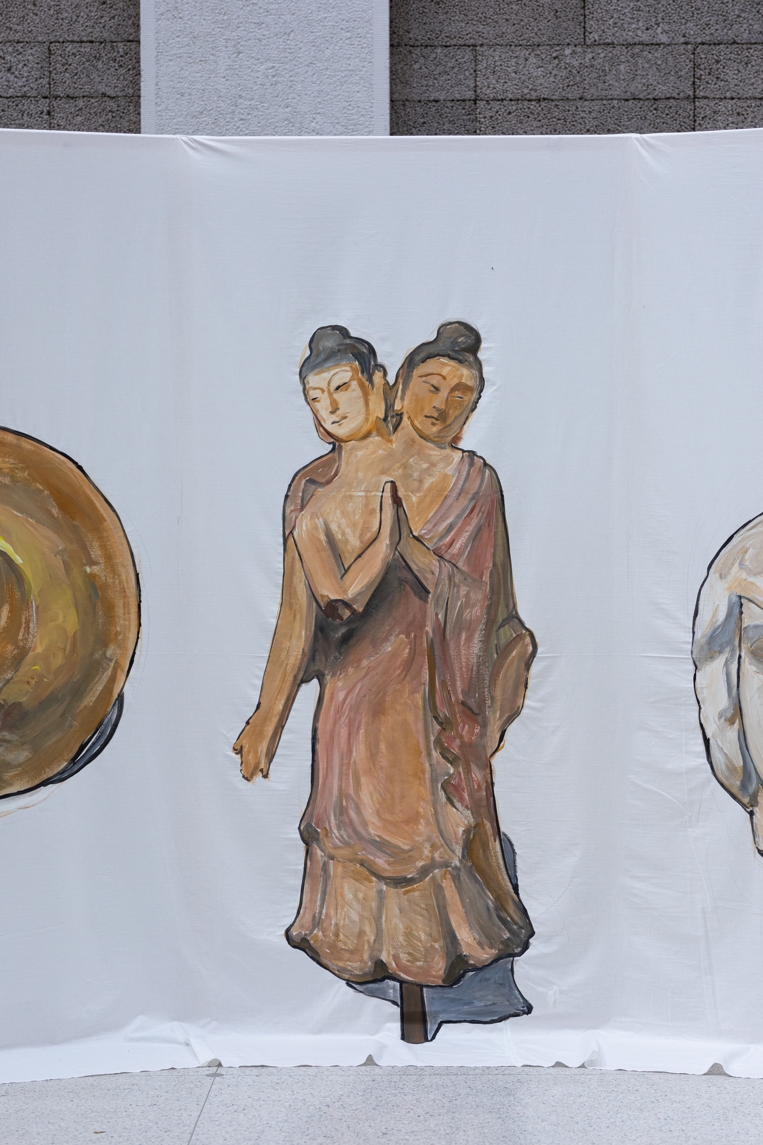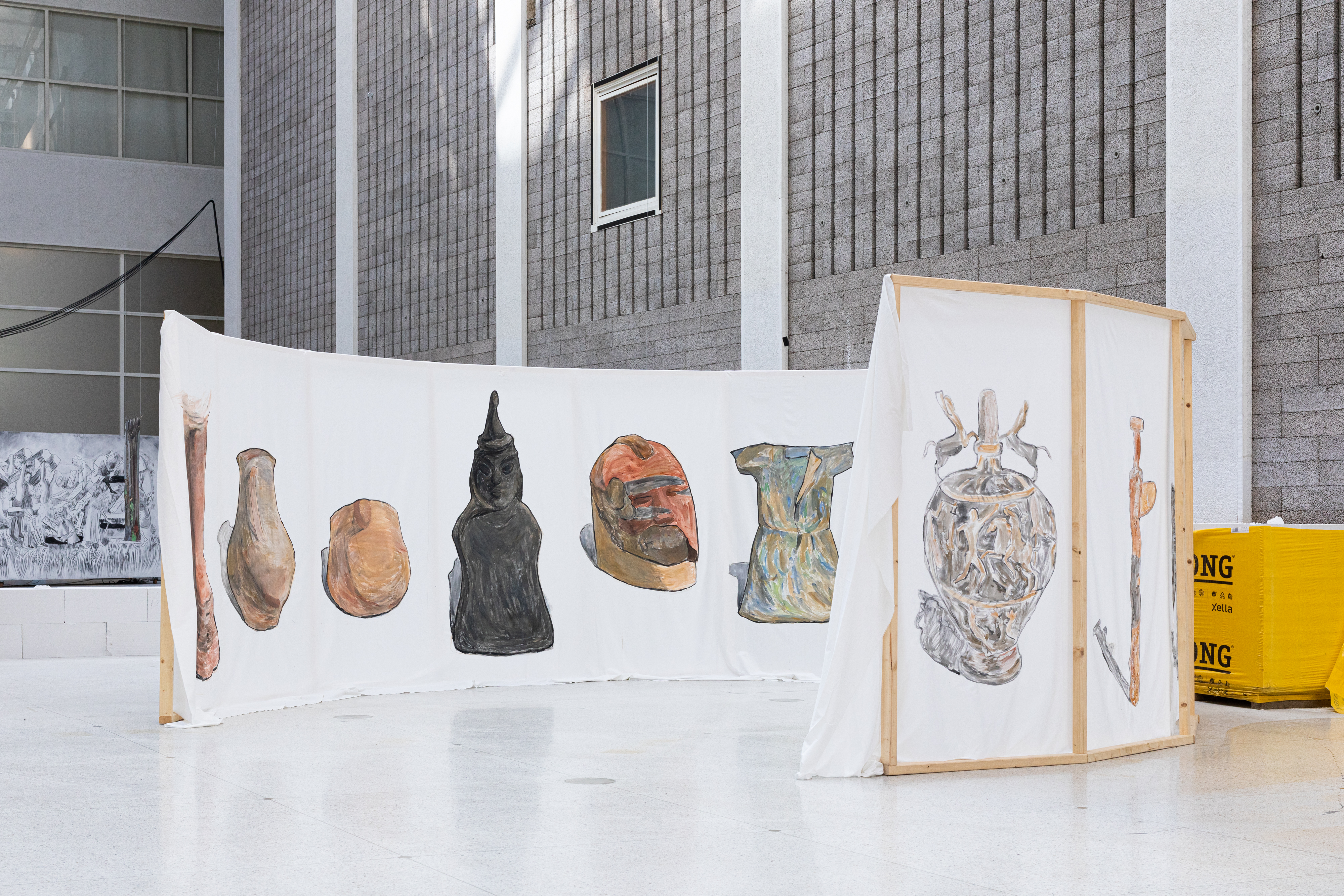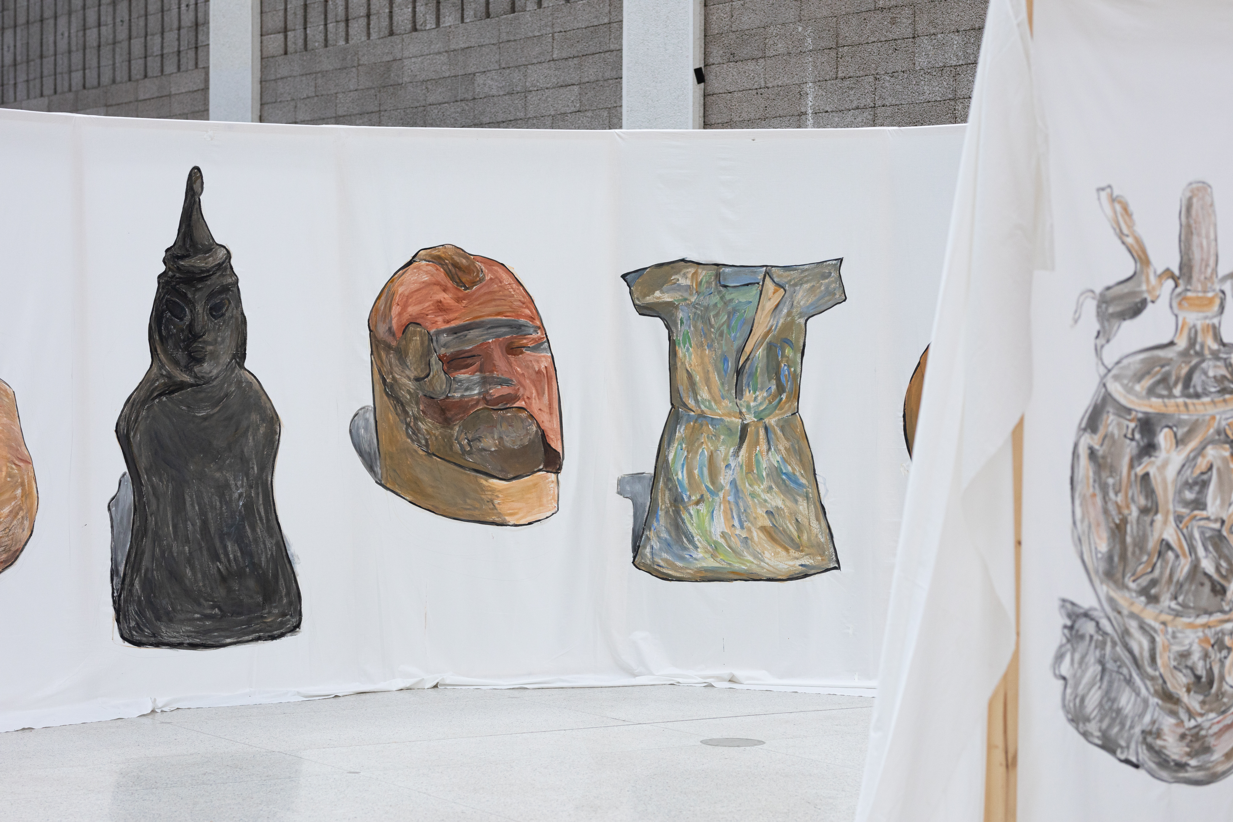 The paintings of Kateryna Lysovenko (lives in Kyiv, b. Kyiv (Ukraine), 1989) are light and sometimes disturbing. In her paintings she depicts landscapes that become wounds, mythical creatures that protect their environments and children, figures with both masculine and feminine characteristics that rest and read in shelters. Kateryna paints war and brutal scenes. She refers to the history of human violence, betrayal, and sacrifice. At the same time, many of her works create safe spaces for learning, care and support. The border between peace and war is very fragile. In her paintings, not only humans, but also objects have a life of their own – they speak, they travel, they kill or protect. In the new installation she puts into conversation objects from the Hermitage museum in St. Petersburg in Russia. They come from various cultures and histories that have been colonized by the Russian Empire. Someone stole them or bought them fraudulently. They ended up in the imperial collection, far from the places of their origin. During the wars, as for example during the ongoing Russian invasion against Ukraine, thousands of them were stolen or simply destroyed. Now they are not even exhibited, or if so – they become symbols of imperial domination. For them the museums are like prisons. Kateryna Lysovenko paints these objects – a vessel from Kazakhstan, a figurine from Dagestan, a tool from Ukraine – and brings them together. She puts them face to face with each other and to the visitors of the exhibition. What story do they share? Do they want to go back home? How can they be free?
