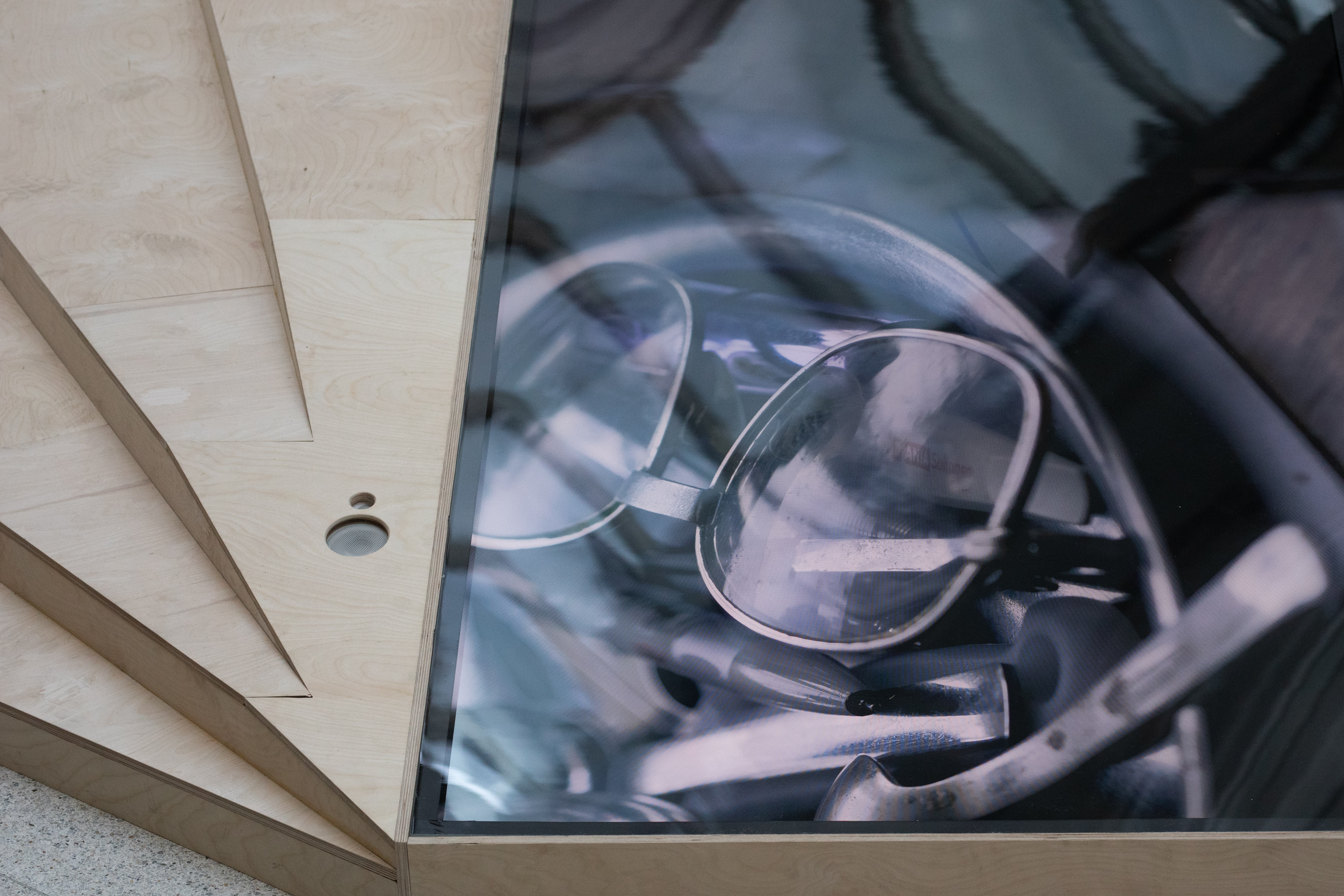 What Lies Above Us in The Shadows Like a Black Cloud / 2024 / video sculpture (8 × 8 m) / 4K, color/ B&W, stereo sound (23 min loop), wood / editing: Jelena Maksimović / cinematography: Staša Bukumirović / sound design: Vladimir Živković / research assistant: Eva Slabá / camera assistant: Michaela Sidorová / translation: Ashley Davis / archival footage: ZF 0369 LIDICE, source: Národní filmový archiv, Prague / thanks: Katalin Erdődi, Kristina Tělupilová, Vojtěch Kyncl, Bohumil Melichar, Michal Simunek, Miloslav Vorlíček, Rike Frank, Christine A. Maier, İz Öztat, Matěj Strnad, Clarissa Thieme, Nela Pietrová / courtesy of the artist
