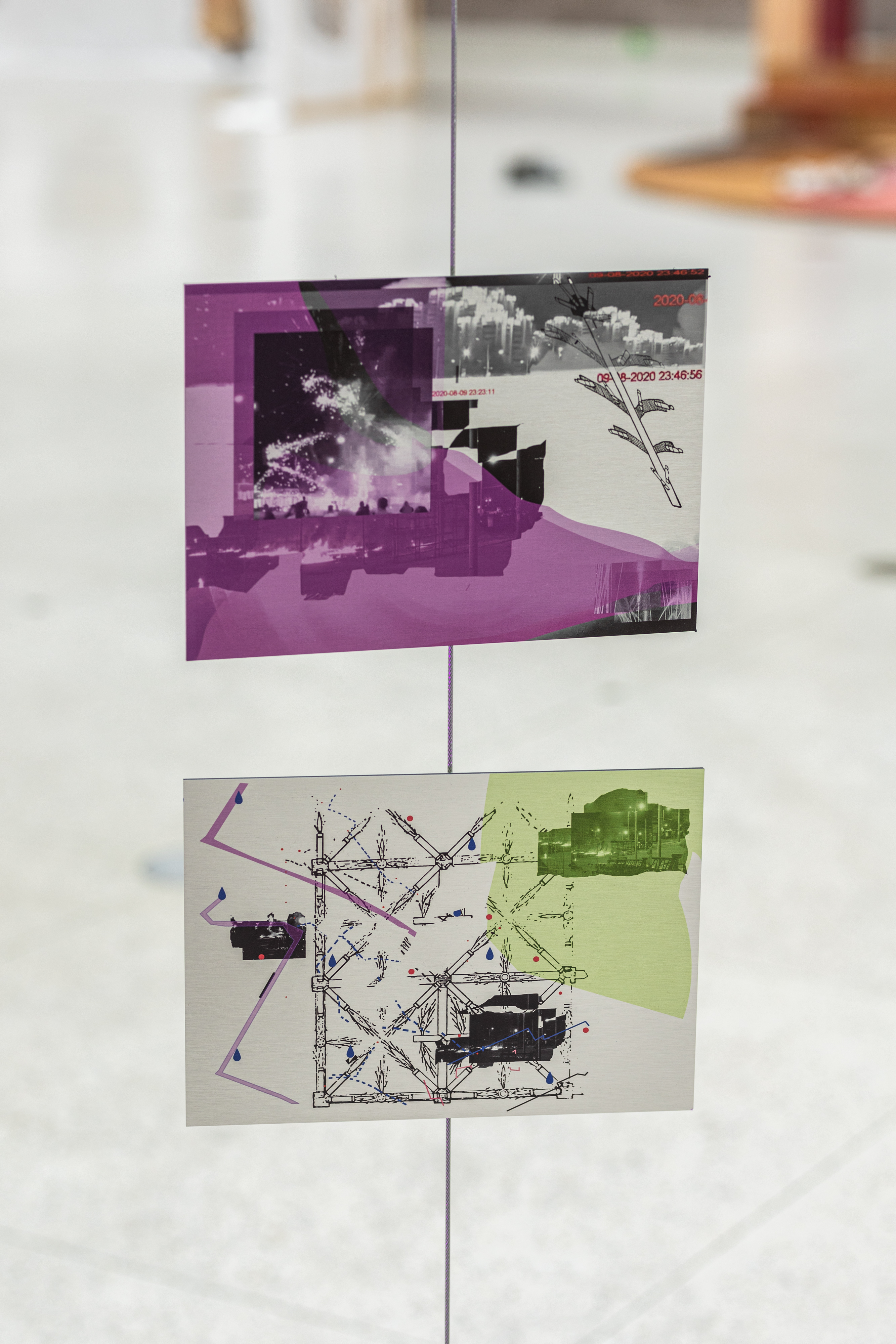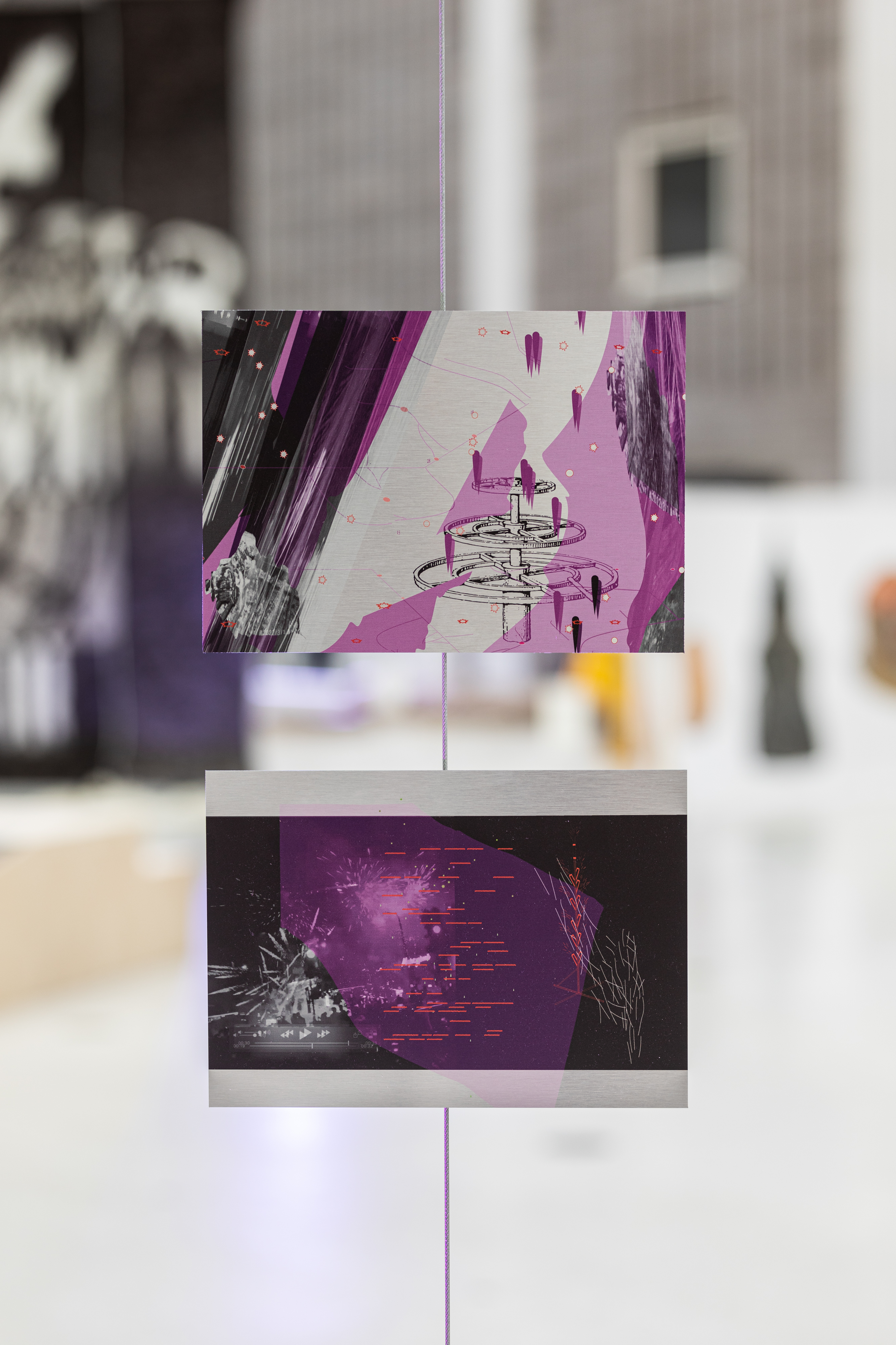 Outdoors, Gunpowder Burns Quietly. In a Closed Space Gunpowder Explodes. / 2024 / installation / digital collages, digital prints on metal (each 20 × 30 cm) / courtesy of the artist