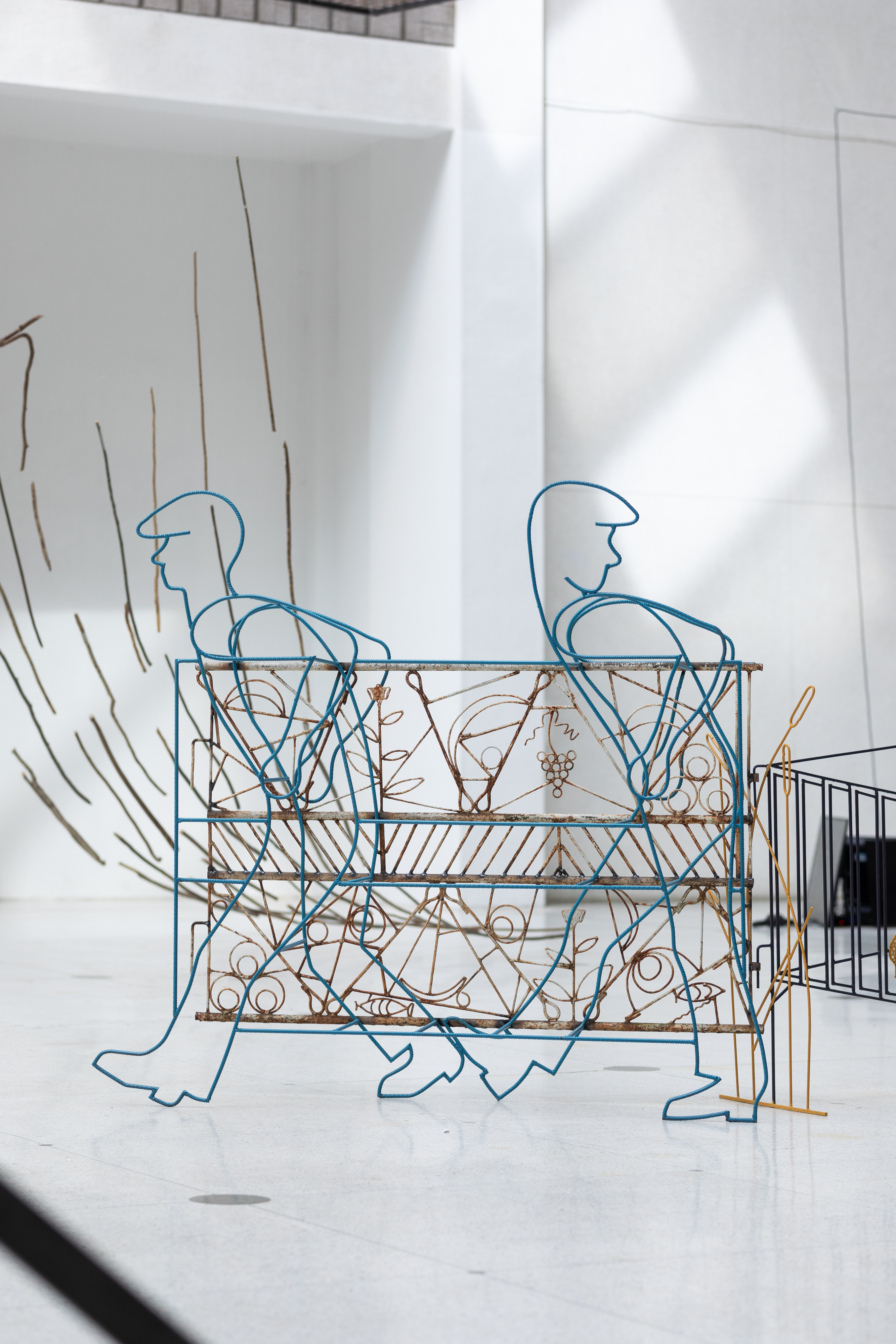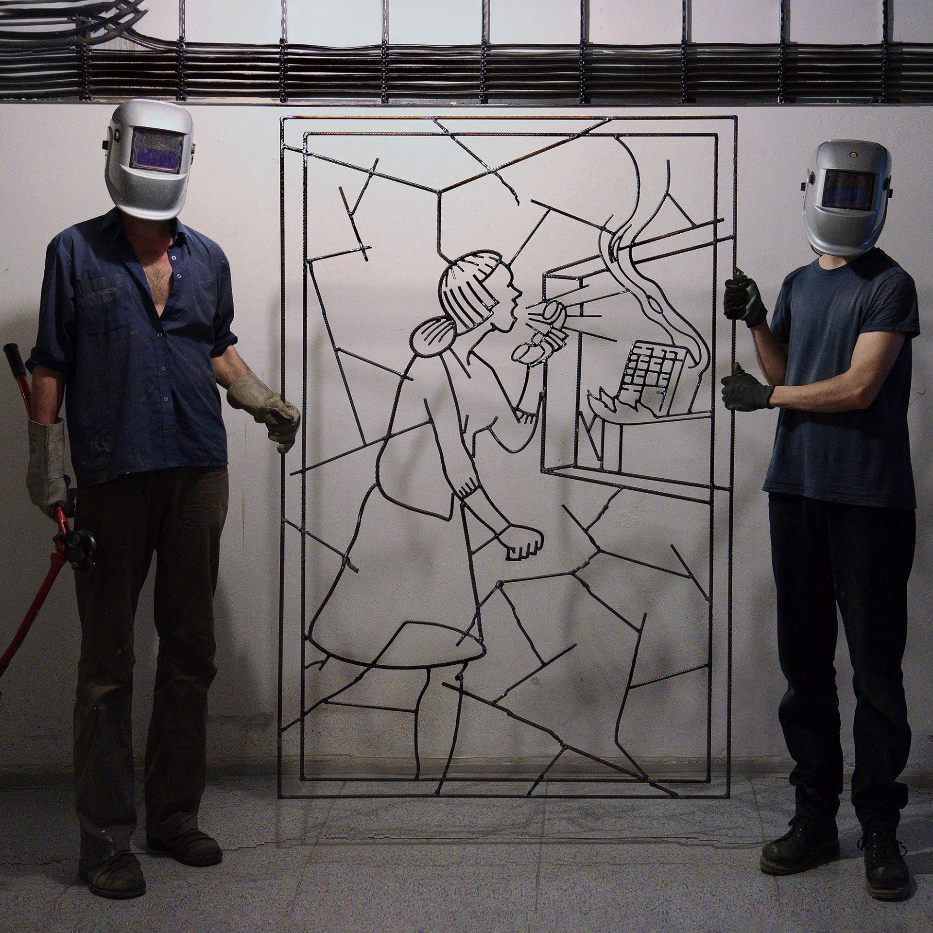 The artists are interested in looking into the tensions between humans and the environment. They imagine a world after collapse, after things have fallen apart. Fence-Scape is made from welded rebar steel, a material with many uses. Rebar stands for reinforcing bar and is used to strengthen concrete. During the socialist era, prefab housing (paneláky) was built with this material. Rebar was also used to create large wall drawings in public space. Artists bent and welded it into pictures showing optimistic scenes to educate people and promote socialism. In villages, people used rebar in a more DIY (do-it-yourself) way. They welded decorative fences, window grids and flower racks. This was their creative response to the lack economy during socialism.