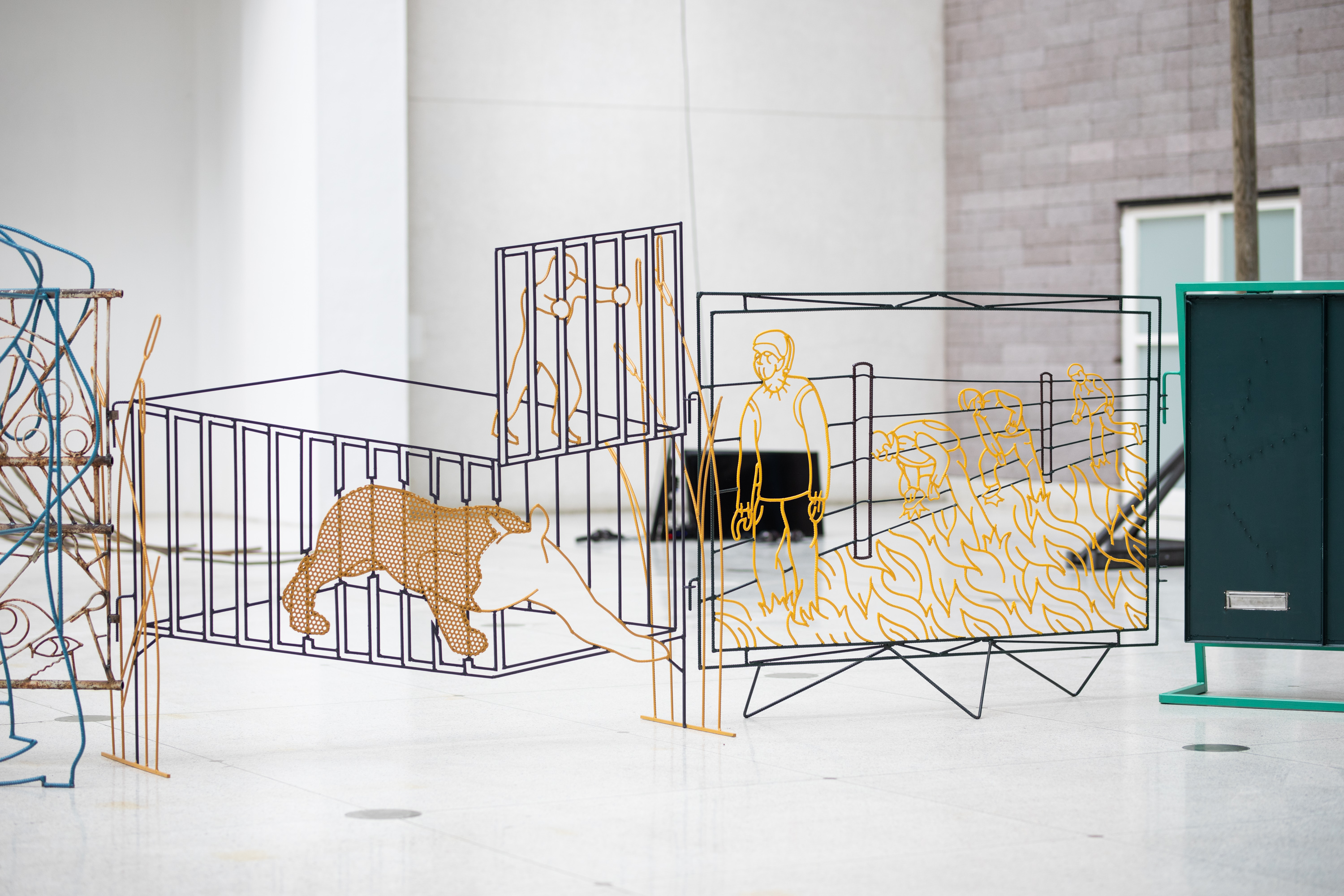Randomroutines sees DIY welding as a form of folk art and uses it to tell their own stories. Fence-Scape mixes the style of educational wall drawings with the do-it-yourself, rural use of rebar. Its form resembles village fences, but also police crowd control barriers. In doing so, it suggests possible future unrest.
