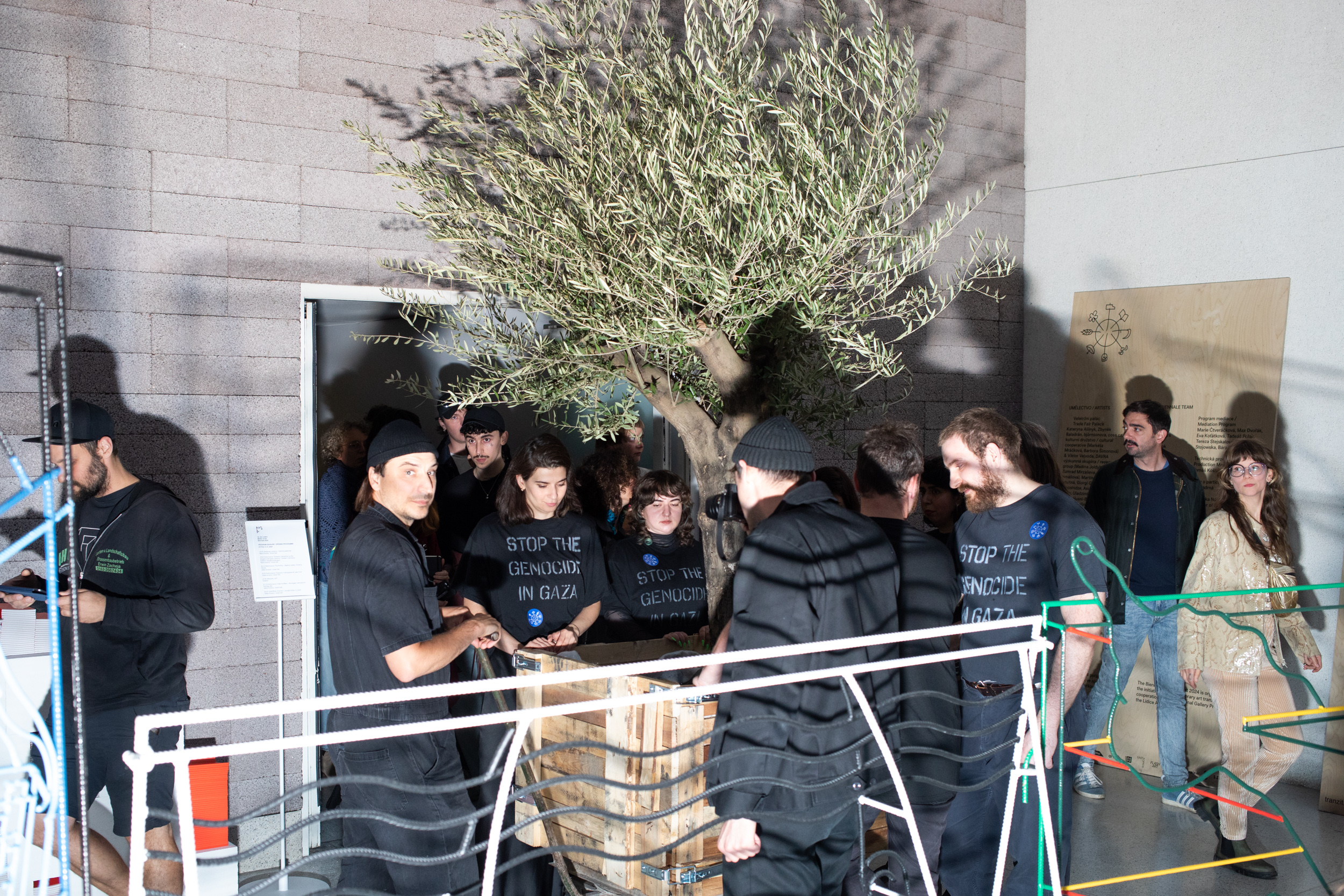 The decision to place an olive tree in the gallery as a symbol of the Palestinian cultural heritage and national identity has a number of goals. The group of artists aims to awaken empathy within Czech society, to draw attention to the humanitarian crisis in Gaza, and to appeal to the Czech political representation to call for the declaration of a permanent ceasefire. At the same time, it expresses increasing frustration with the silence of art institutions and the bias of the Czech media. Unlike other exhibits, the olive tree is not a part of the exhibition; it is placed there as a foreign object precisely because it concerns a topic which in the Czech Republic is strongly linked with the rejection of all that is “foreign.” An integral component of the work is also the very question it raises: Is it ethical to leave an olive tree to wither and die inside the National Gallery? What does it symbolize?