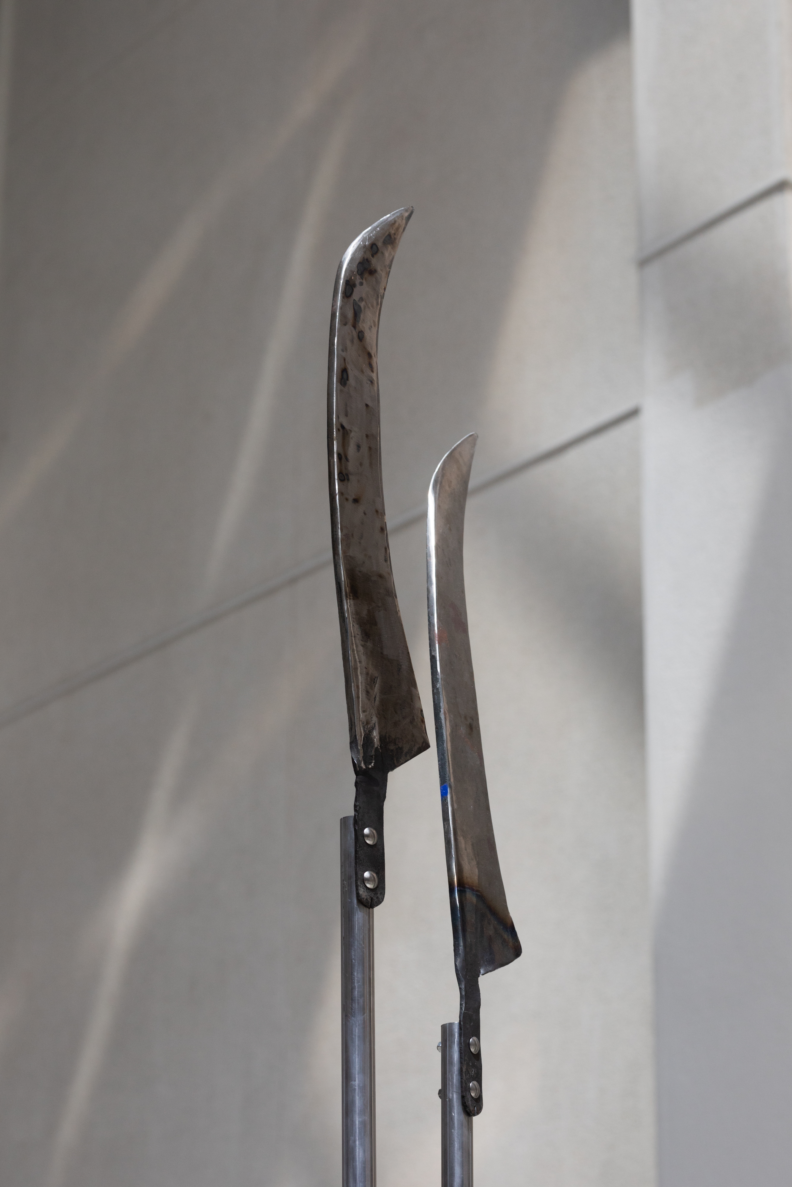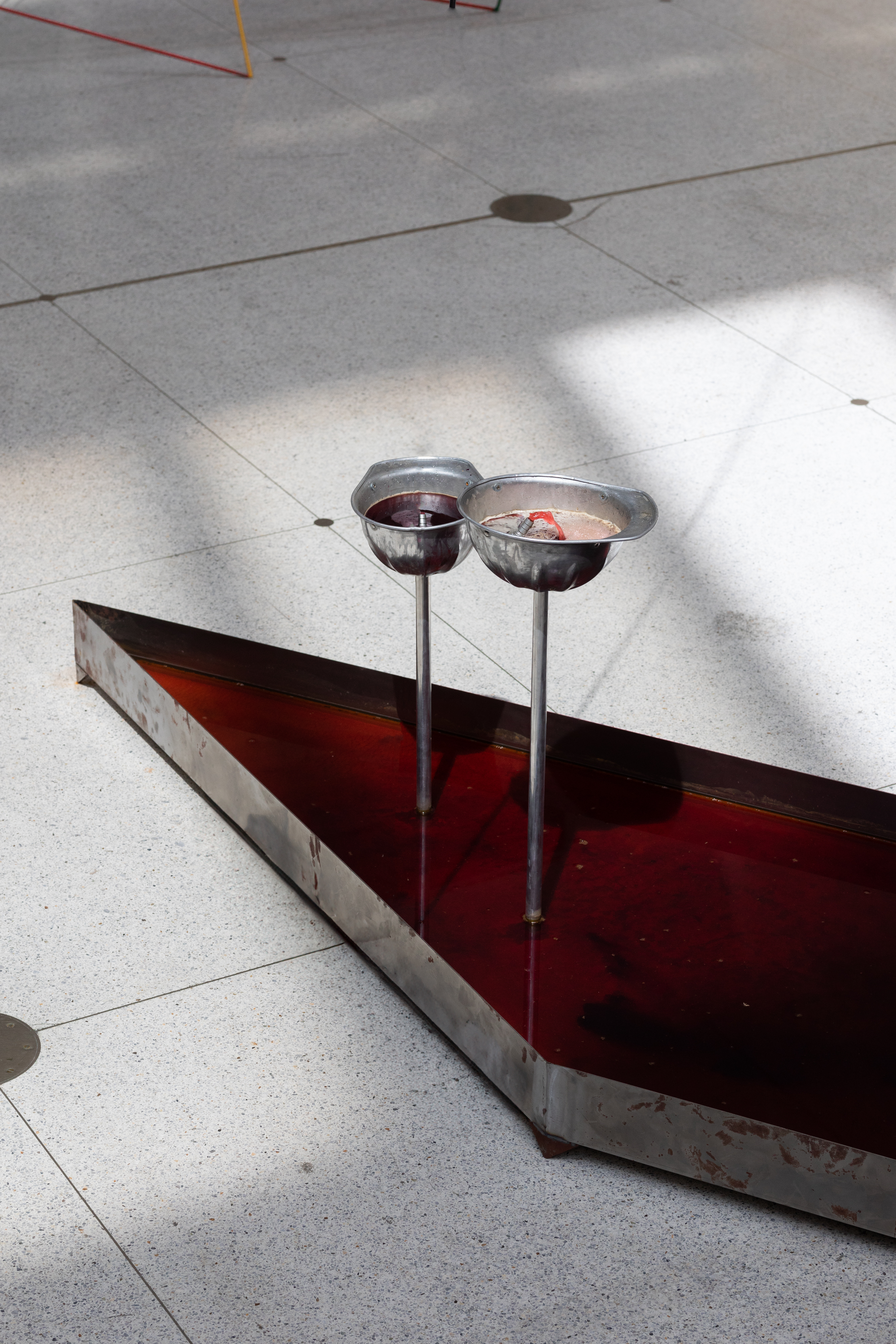 People of Salt / 2024 / installation / metal, aluminum, scythes, pumps, water, potassium permanganate, potassium, found objects / courtesy of the artist