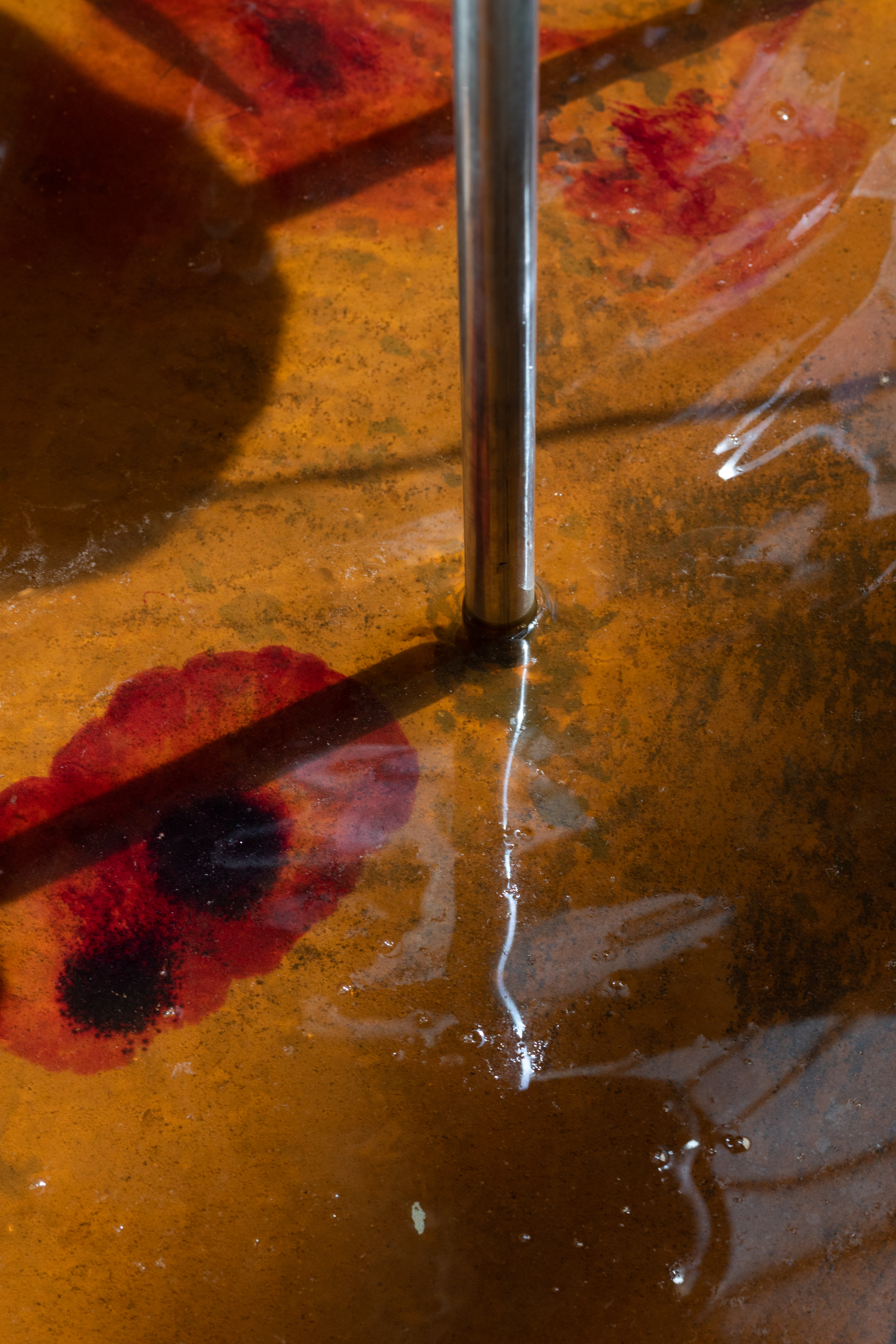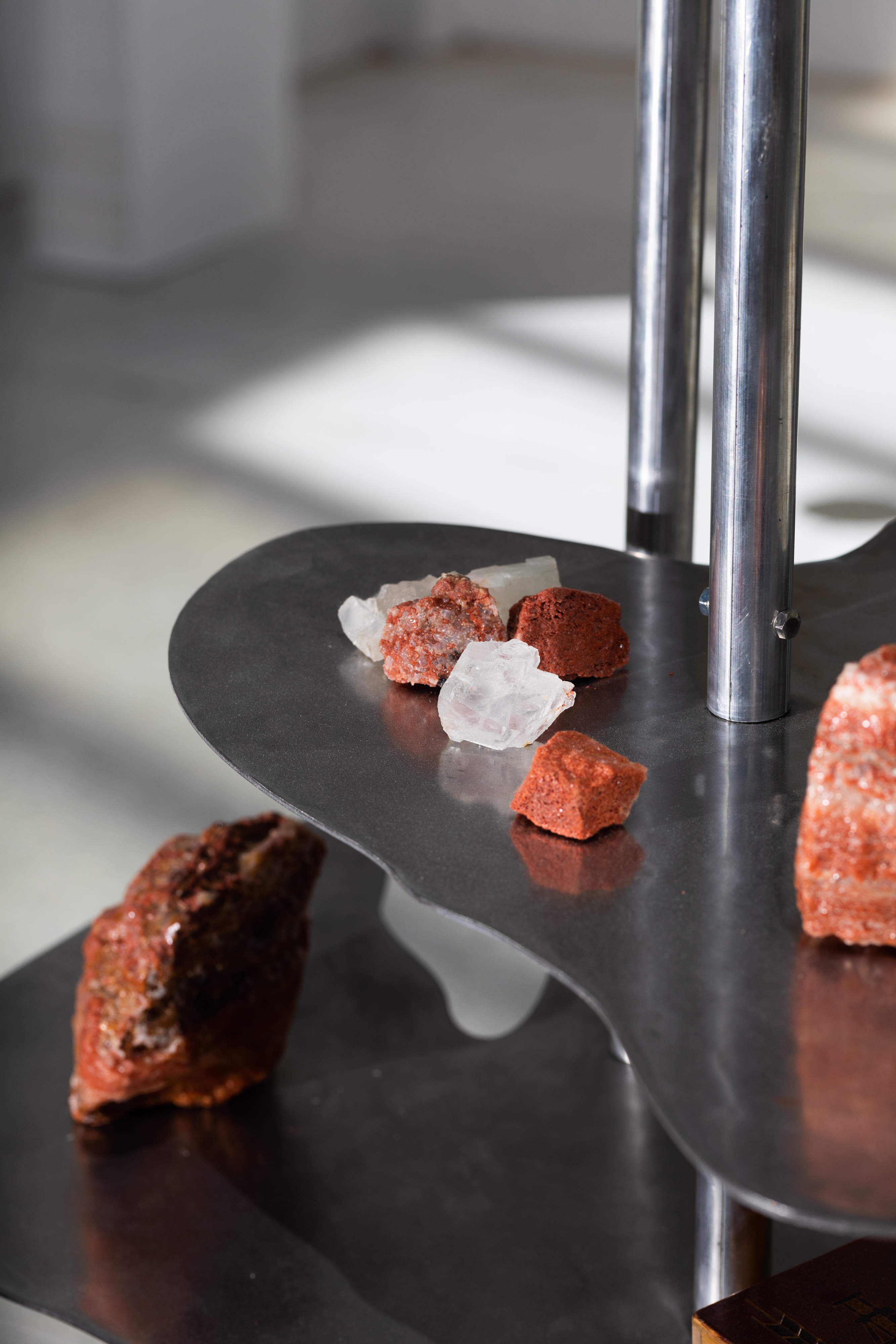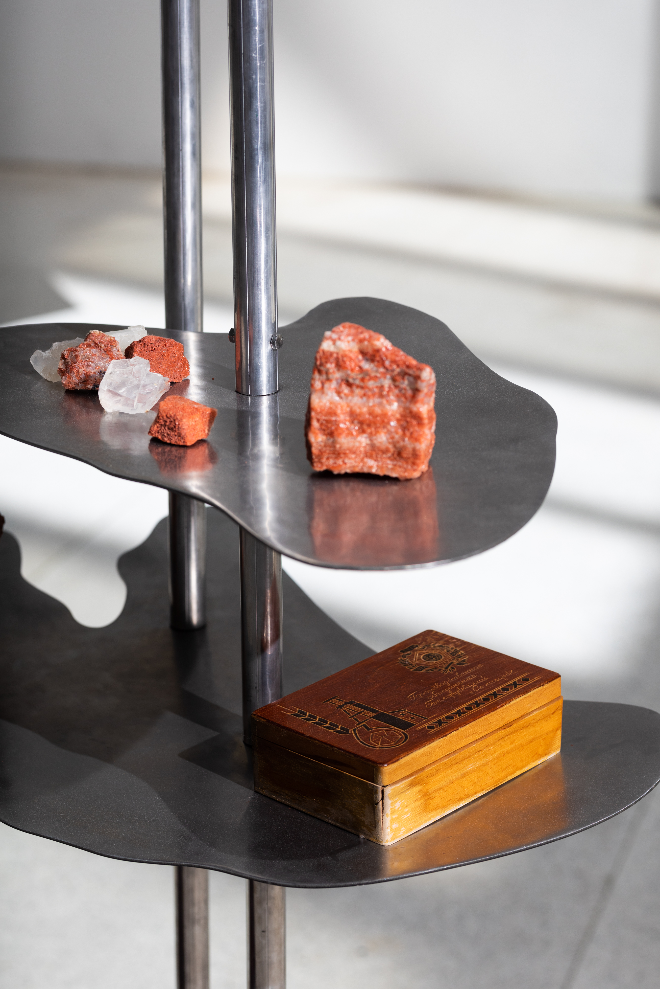 In his artworks Uladzimir Hramovich (lives in Berlin, b. Minsk (Belarus),1989) uses materials that are also used in museums, construction sites, monuments. He asks the question: what if these materials, like concrete, granite, metal, and glass, not only get worse over time but also change history? In People of Salt he creates a fountain with different unusual elements. It is connected to the history of the city of Salihorsk. The city is famous for its salt mines. The water is colored with a potassium permanganate – salt that is extracted there. Some of these objects, like helmets, represent the hard work people do in mines, quarries, and construction sites. Others, like scythes, represent agricultural work in the countryside. Peasants used to fight their masters with scythes. The helmets are now fountains and the scythes are displayed with their blades pointing upwards. Their shape is changed – from the tools of work they became tools of struggle. The objects shown in the artwork are a symbol of workers and peasants fighting for their rights. The artwork is about two uprisings in Belarus. One happened in 2020 when workers went on strike against state and police violence. Many workers from the Salihorsk mines joined the strike. The other happened in 1863 against the Russian Empire’s colonial rule. The artist connects these struggles and how they were forgotten over time. The current government in Belarus is removing all memories of anti-colonial struggles, including monuments and texts in school books. Both the uprisings of 1863 and 2020 have failed – but what does the failure represent? How can we remember it and make use of it in the present moment?