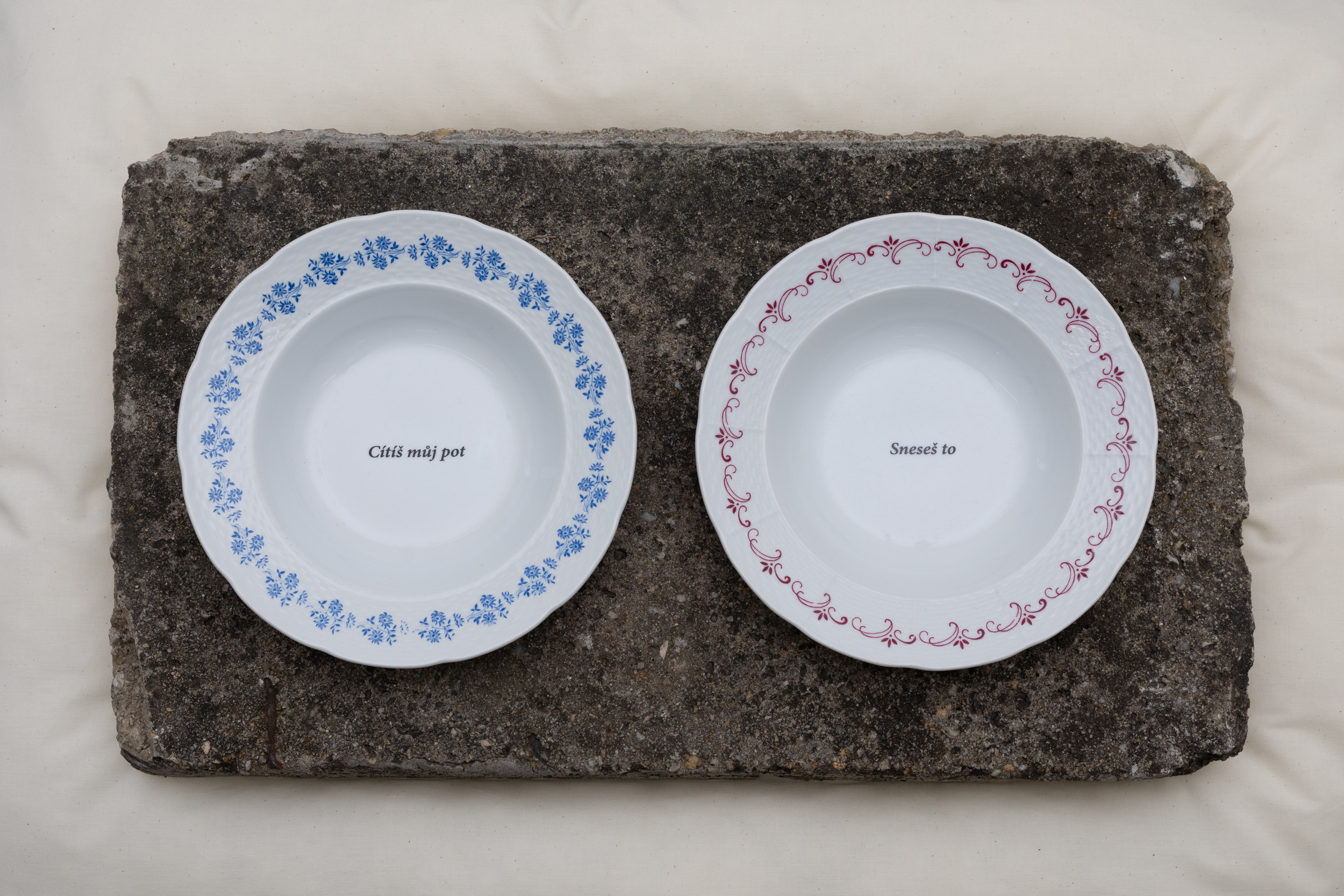 Omezení je tedy interpretační klíč pro obecnější pochopení její tvorby. Ve výstavě, v níž se nacházíme, se materializuje v podobě objektů, jejichž život zde nekončí. Betonové bloky byly vzaty a budou navráceny své funkci stavebního materiálu na chatě Javor, která bude v budoucnosti sloužit jako místo uměleckých rezidencí na venkově. Polštáře poslouží jako opora pro sny unaveného, ale spokojeného kulturního pracovnictva. A talíře nám při společném stolování budou připomínat základní a nedělitelné zdroje energie pro lidský život, jídlo a poezii.