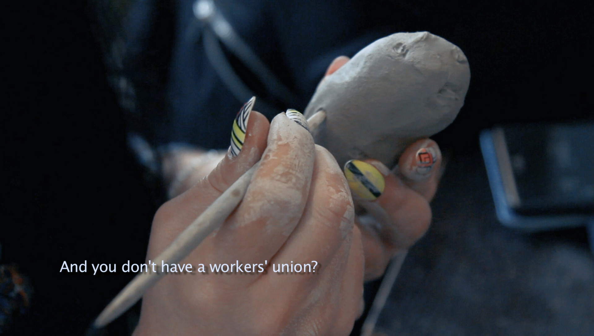 Alicja Rogalska will introduce and screen her video work The Royals (2018–2019), created in collaboration with migrant potato farm workers on the Island of Jersey (British Islands). The video documents a series of conversations about establishing a prize for the best employer in the agricultural sector and about starting a trade union. During each session, the workers made clay potatoes, relying on tactile memory. One of the potatoes was cast in bronze as the prize—yet to be awarded.