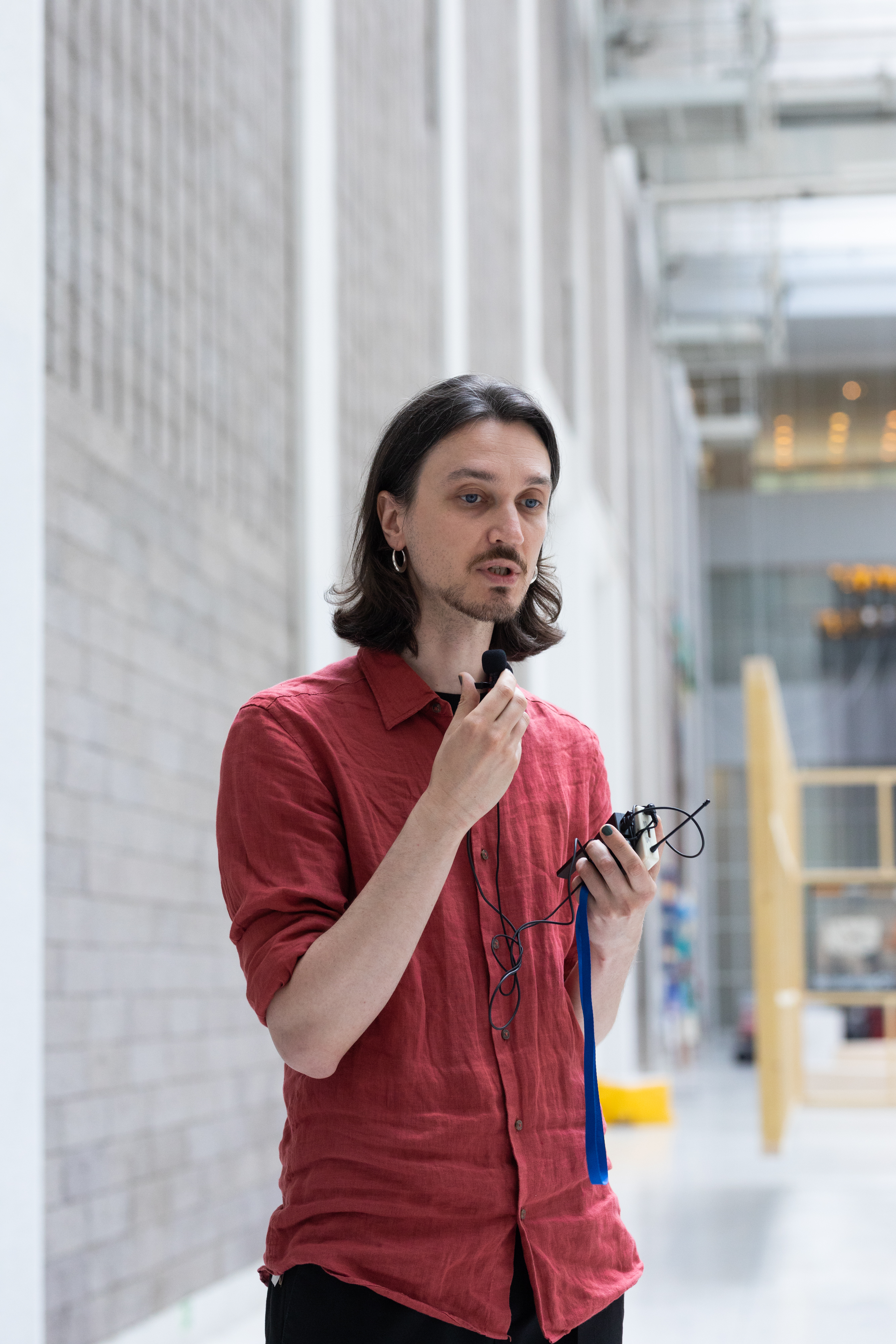 Uladzimir Hramovich is a Belarusian artist who currently lives and works in Berlin. He graduated from the Gymnasium-College of Arts named after I. O. Akhremchik in Minsk, Belarus, in 2009 and the graphic arts department of the Belarusian State Academy of Arts in Minsk in 2015. He has been a member of the Problem Collective since 2016. Hramovich works with installations, graphics, and video. For him, materials such as concrete, granite, metal, paper, and paint are not just surfaces for history to leave its imprint on but agents that are able to deform history. In his artistic practice, Hramovich draws on the history of modernist art and architecture, the history of ideology and political movements, and the transformation of the urban space in Minsk. He is interested in the tension between the past and the present and studies monuments and rituals of memory that are overloaded with ideological meanings and embodied in material objects.