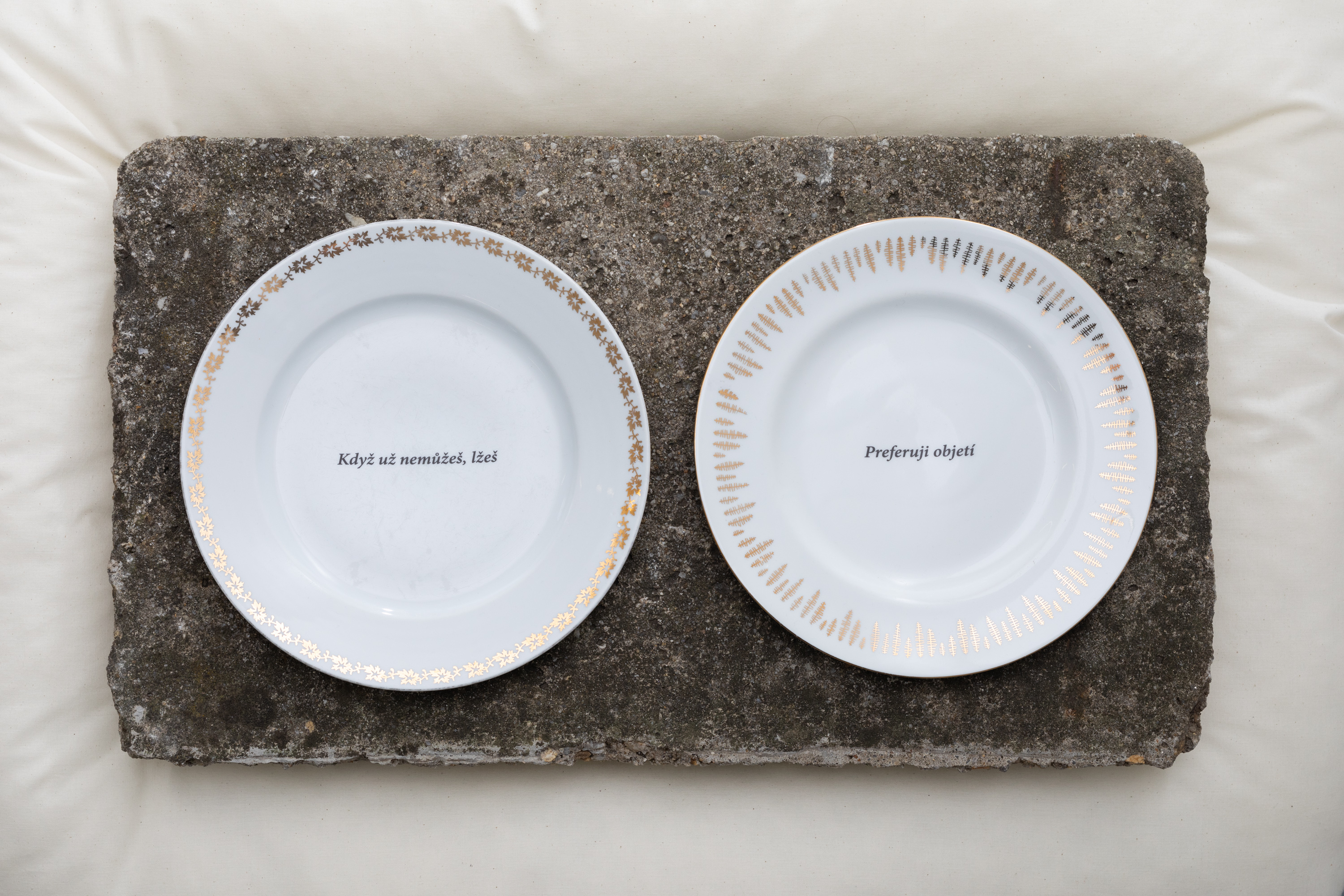 The texts on the plates are an important part of the exhibition. Their reduced and incisive form is combined with the limitlessness of the poetics, whose interpretation is entrusted to the audience. It is the reductive form of the texts as well as their visual morphology that define Sráč Sam’s poetics—precision and at times a certain severity, but often with humor. The sentences found on the plates are a curated collage of texts by Sráč Sam, selected and arranged by František Fekete. They are always diptychs. Beneath their seemingly civil contents hide bubbling emotions. Each couplet contains a hint of a relational dynamic or a dialogue (although it is not clear whether it is a dialogue between you and me or an inner monologue). It is a union of opposites; we can imagine it as yin and yang.