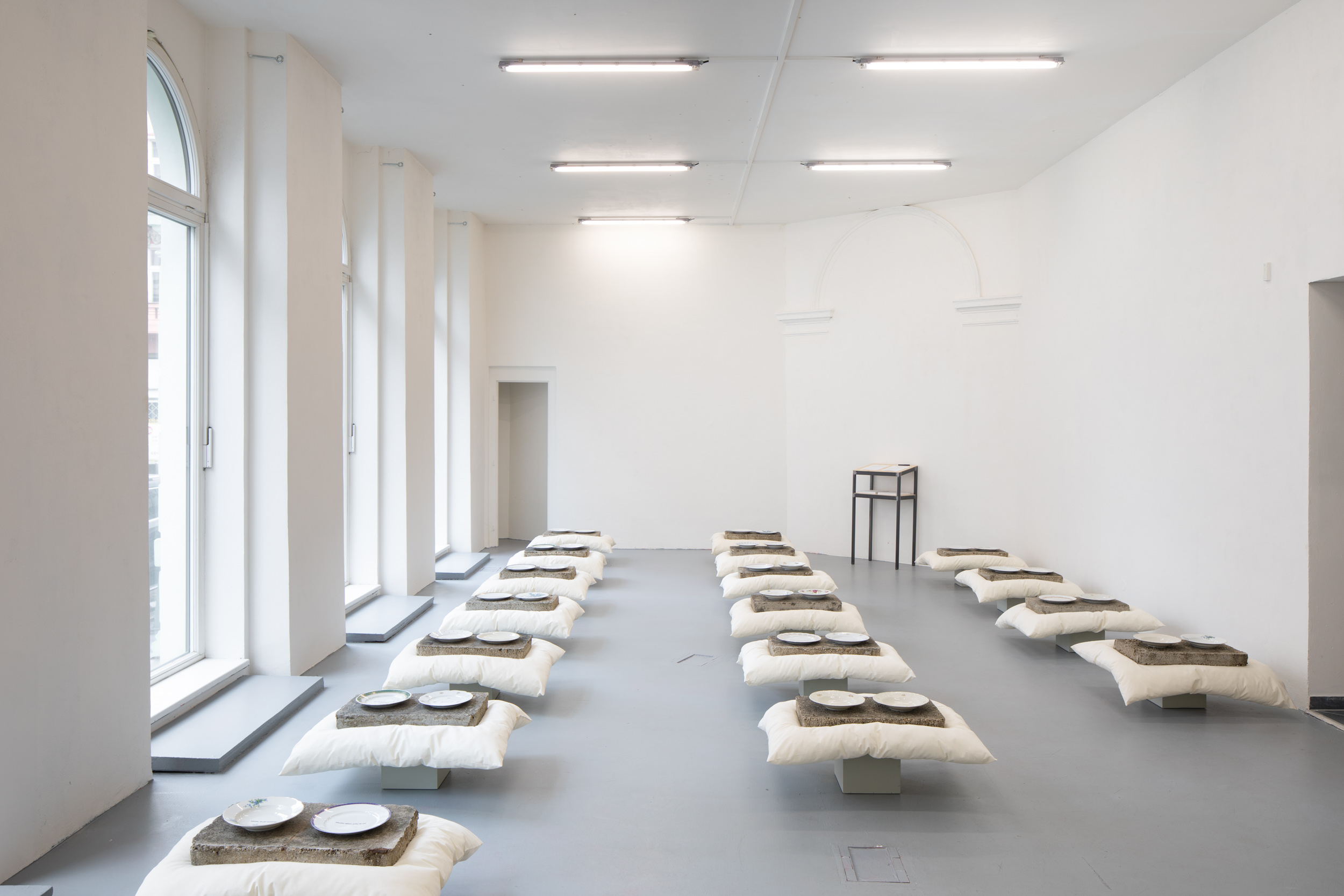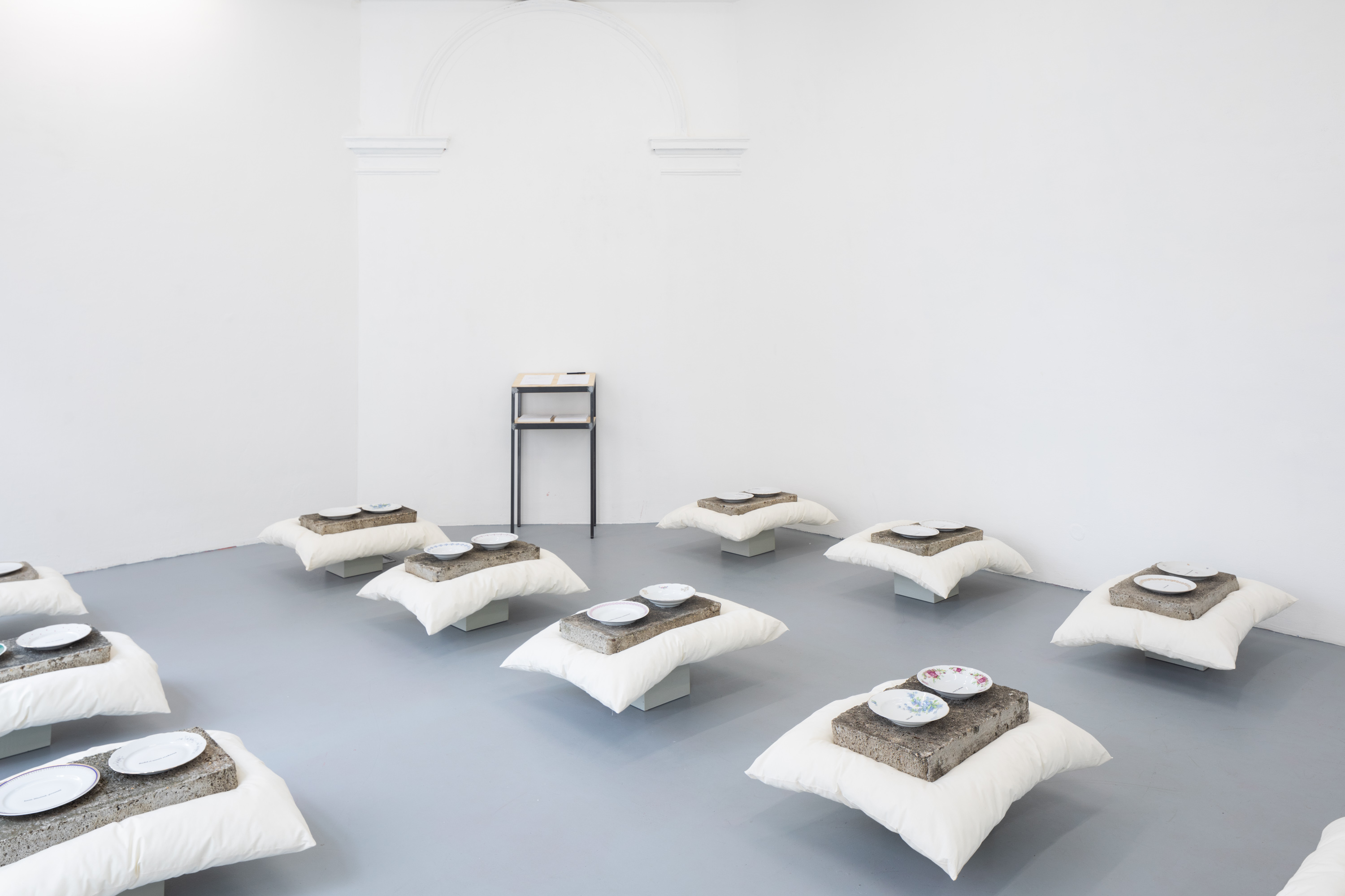 Restraint is thus an interpretive key for a more general understanding of her work. In the exhibition we find ourselves in, it materializes in the form of objects whose life does not end here. The concrete blocks were taken from and will be returned to their function as a building material at the cottage Javor, which in the future will serve as a space for artist residencies in the countryside. The pillows will prop up the dreams of tired but contented cultural workers. And the plates will remind us, as we dine together, of the fundamental and indivisible sources of energy for human life, sustenance, and poetry.