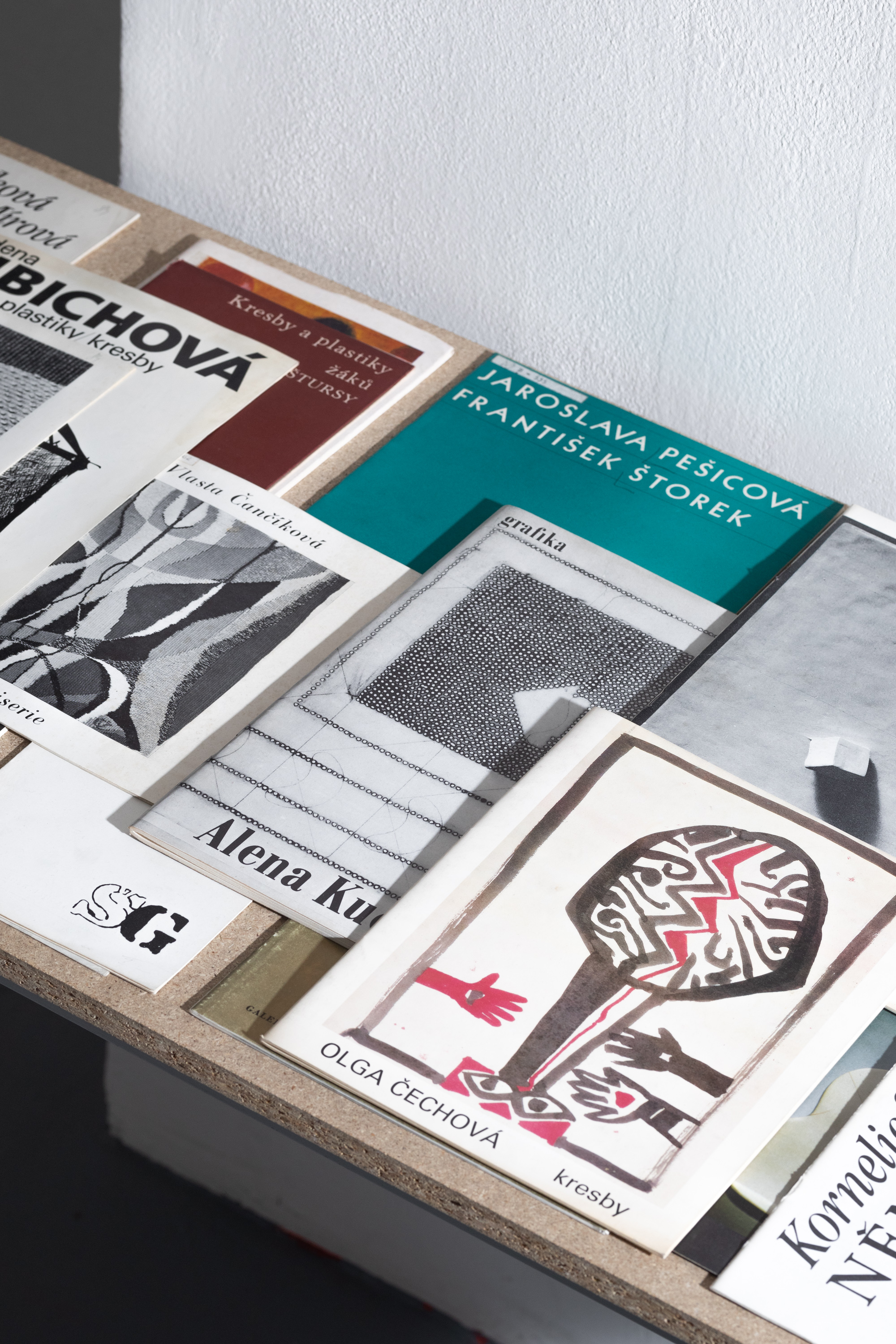 The installation of pillows, concrete blocks, and plates with texts alludes to a long-standing interest in women artists, whose work and everyday realities are often obscured by the unyielding weight of history. We can find artists who are invisible, hidden, obscured, or forgotten. The audience can acquaint themselves with this research in the second part of the exhibition, where archival catalogs and monographs are presented for study. Within them we find an oeuvre and a life that have their value, even in shades of visibility that must be reached through personal attention and interest.