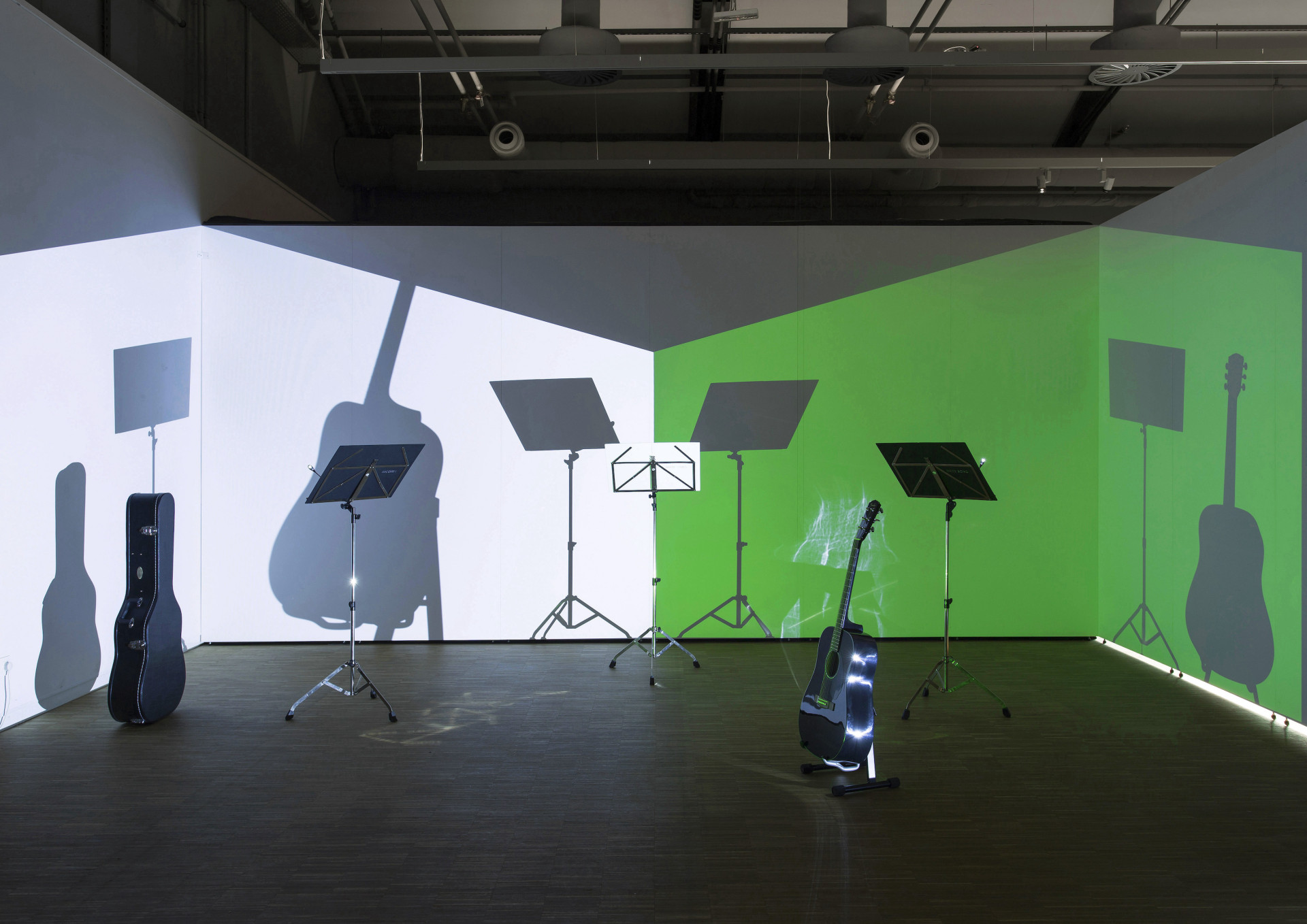 Hajnal Németh, White Song – Among Others, 2017, stage installation, textbooks and scores on music stands, acoustic guitar, guitar case, color projection, New Budapest Gallery, commissioned by Leopold Bloom Art Award, photo by Tamás G. Juhász