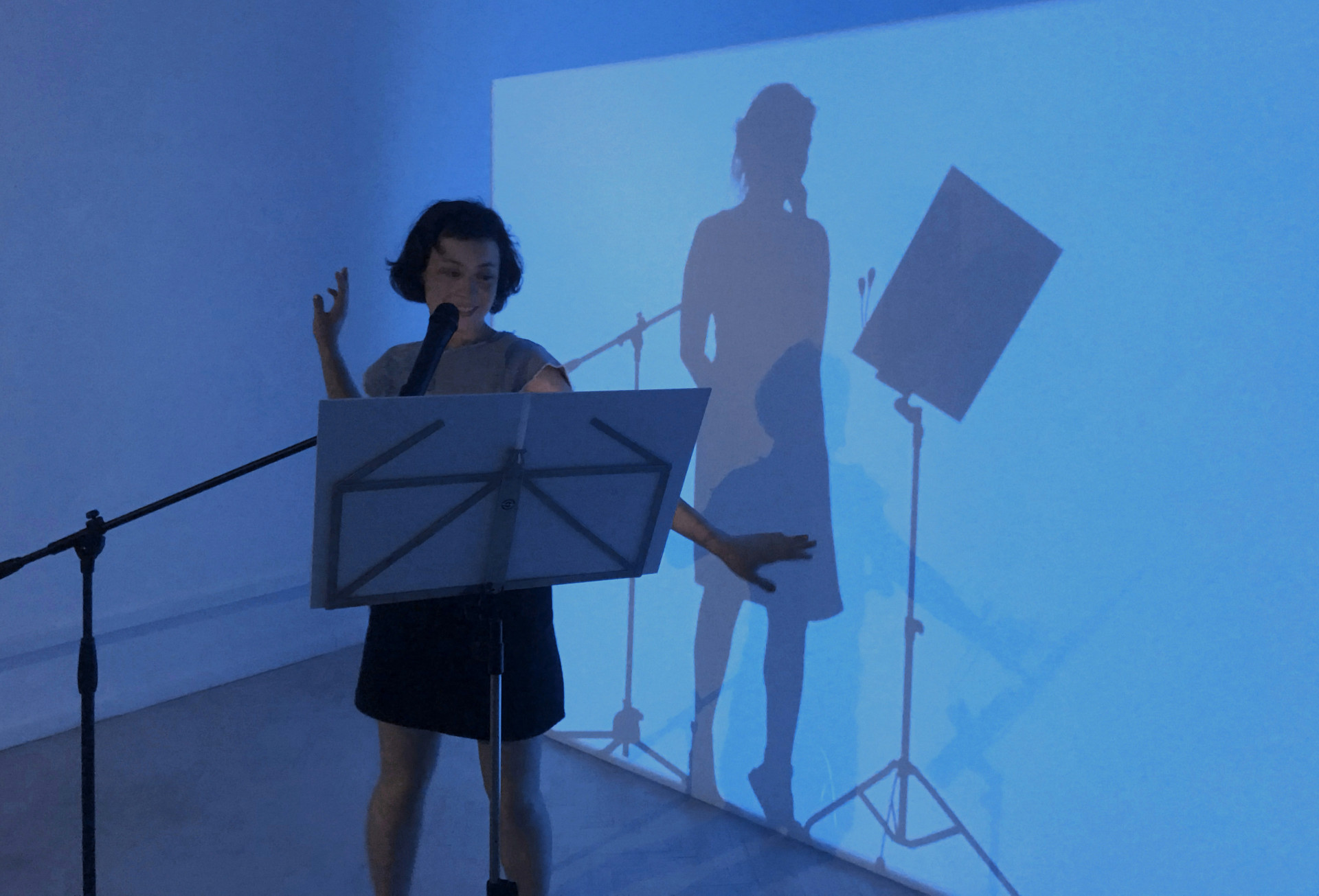 Hajnal Németh, My Time, Your Time, 2020, karaoke stage installation, 2 textbooks on music stands, 2 microphones, color projection, Gallery ffrindiau, Budapest, photo by the artist
