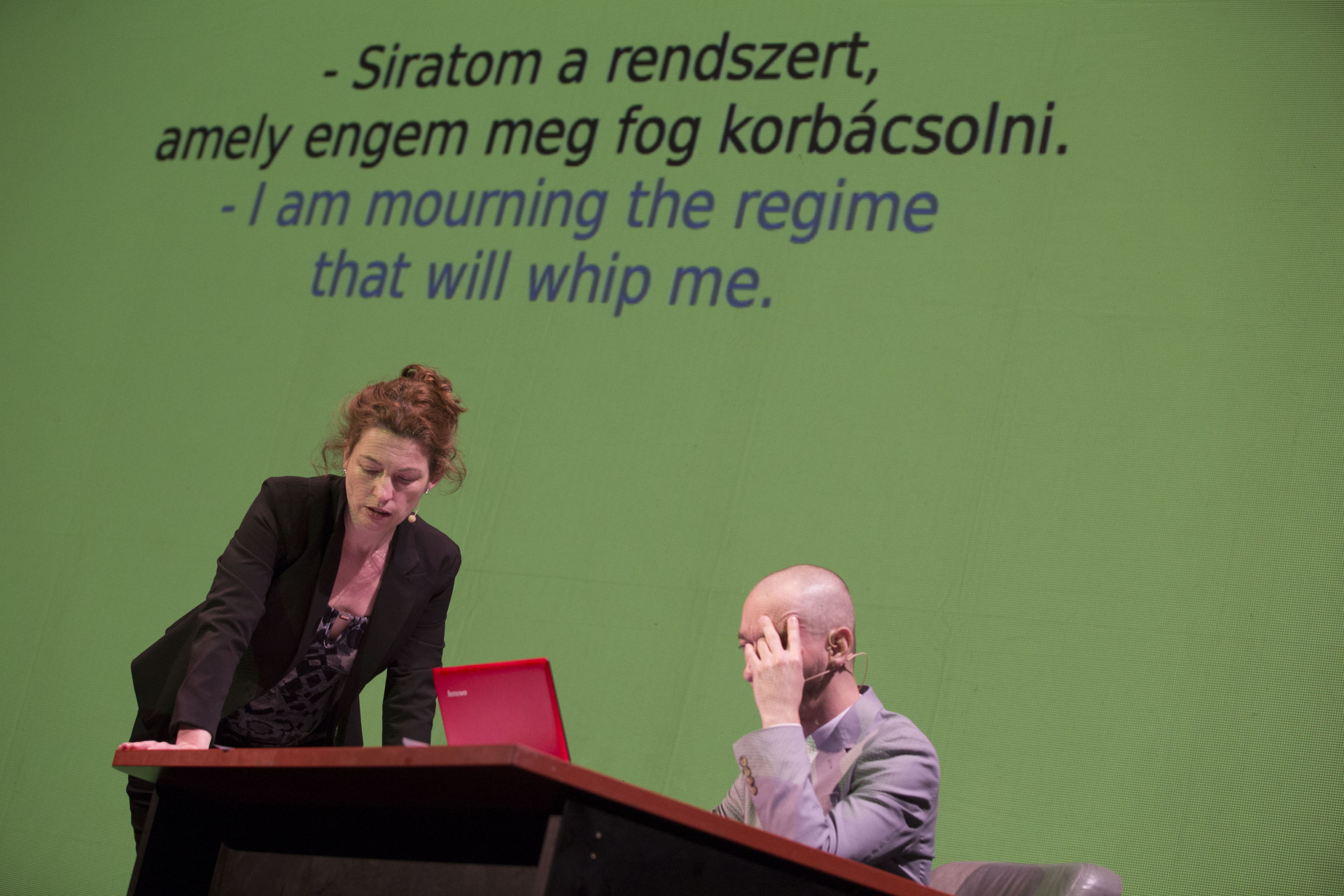 Hajnal Németh, The Loser (The Banker), 2015, experimental opera, 40', delivered by Andrea Csereklyei and Kornél Mikecz, Átrium Theater, Budapest, commissioned by OFF Biennale Budapest, photo by Zoltán Kerekes