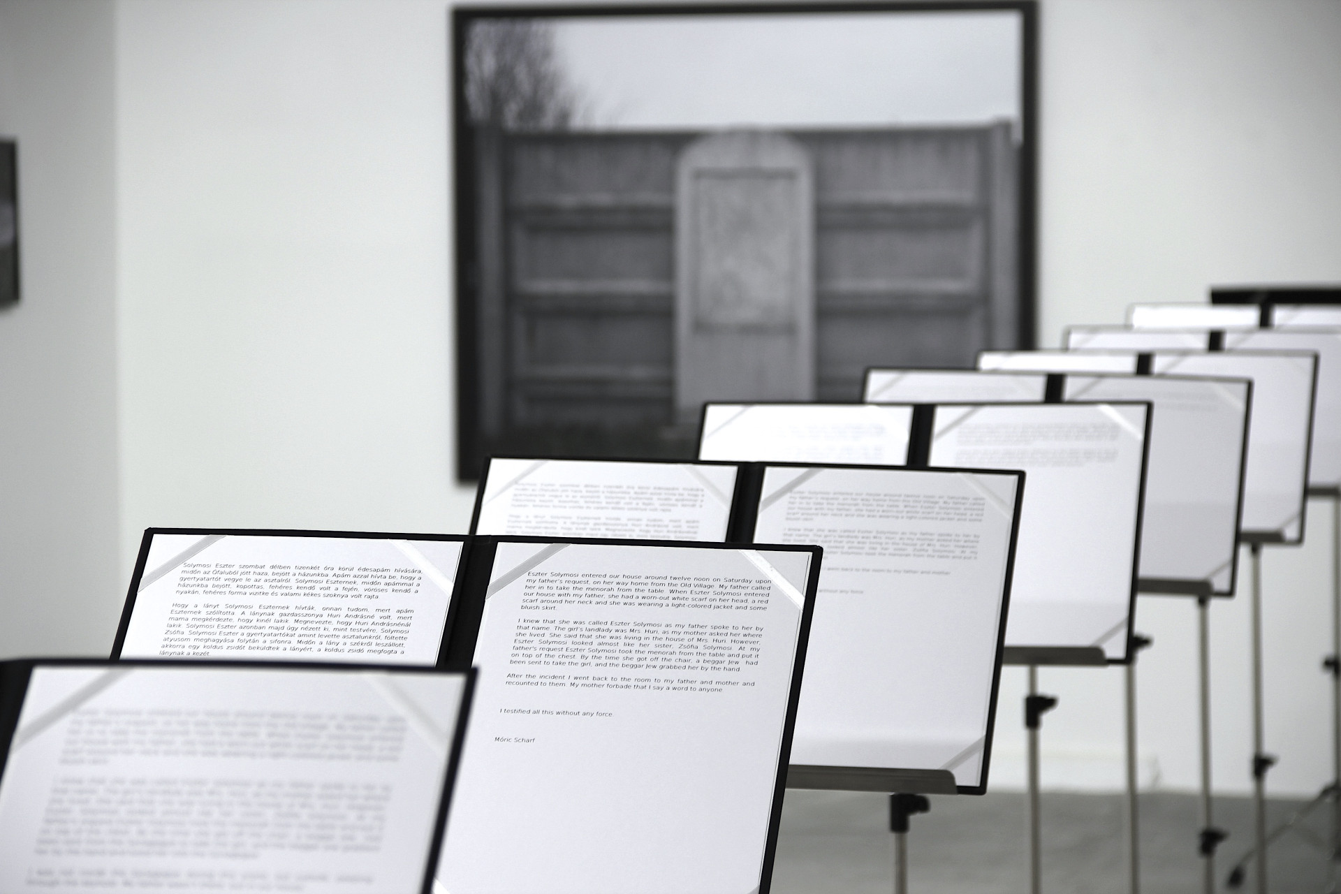 Hajnal Németh, False Testimony - Version 3, 2013, photo series and sheet music installation, 11 transcriptions, commissioned by OSA - Open Society Archives, Galerie Ebensperger Berlin, 2017, photo by the artist
