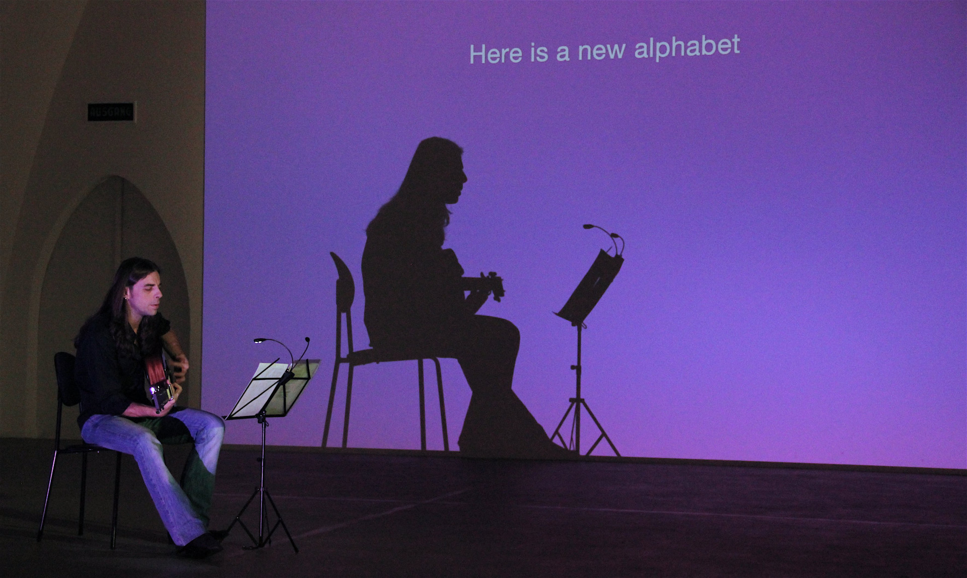 A further implication of my “process-mania,” is that the formal public representations of my works actually render the work process and my work methods transparent. My installations convert scores, music stands, instruments, and sound and lighting equipment into diverse stages, rendering them accessible to and usable by the spectators. The films made of the concerts and performances often document the recording process. Sometimes the venue is a recording studio, and the performers often read the librettos from their hands or from music stands. The accompanying photo series are often behind-the-scenes photos, and the posters, in a way, are advertisements for the shows.