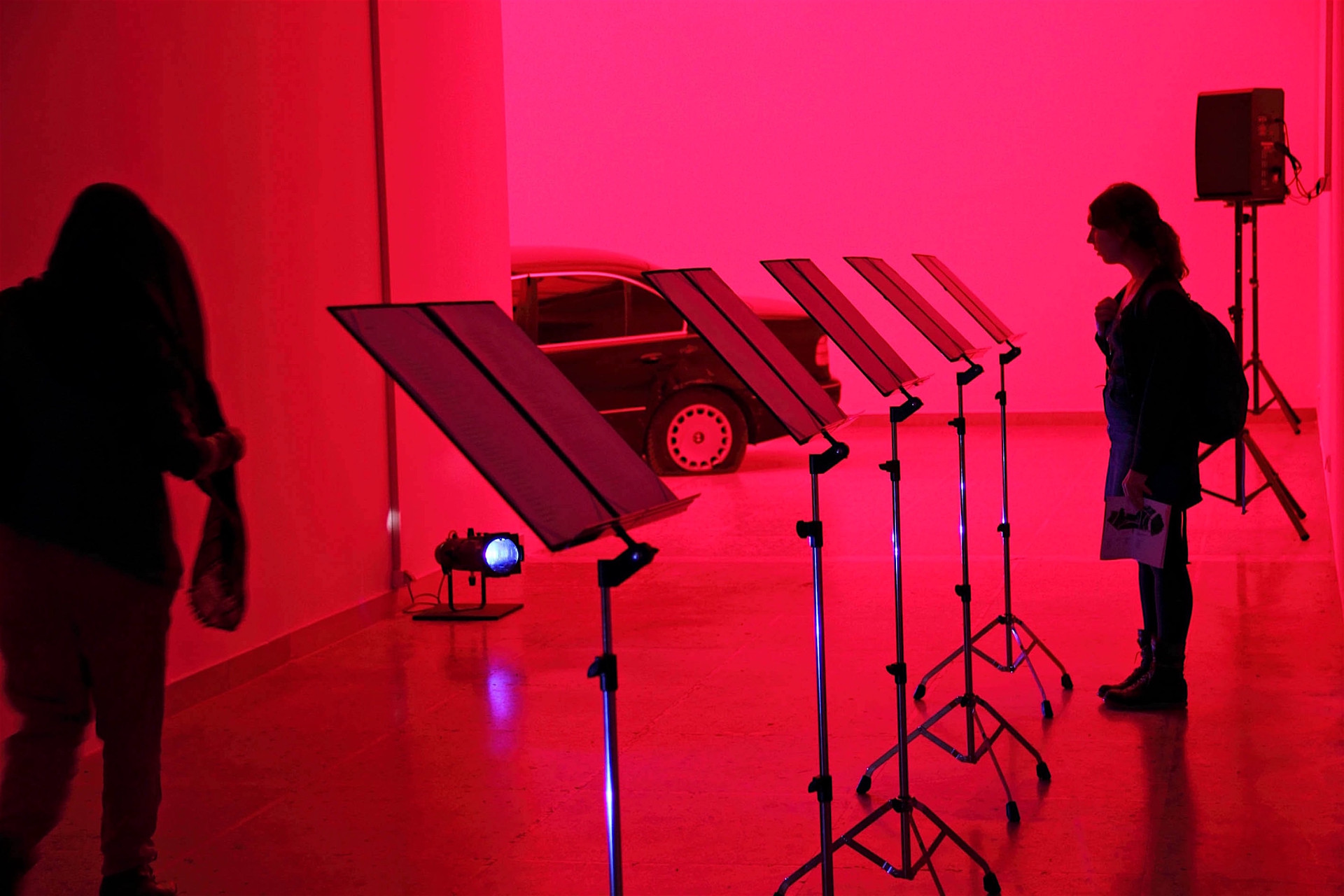 Hajnal Németh, Crash - Passive Interview, 2011, object and light installation with 8 channel audio, 12 librettos on music stands, 54th International Art Exhibition - la Biennale di Venezia, Hungarian Pavilion, photo by András Sólyom