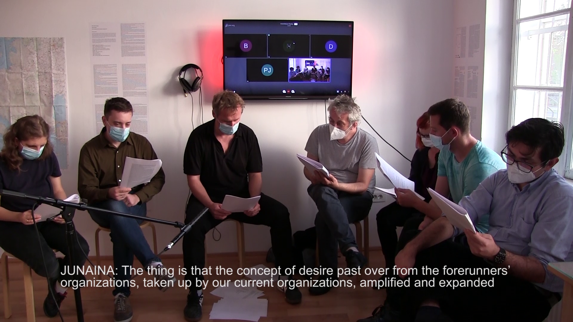 Ovid Pop, The Council of Peace, Utopian Chronicle, direct translation from Revolutionary Language (RL), 2020, new commission in the scope of the project Conditions of Peace (Iași, Belgrade, Vienna, Helsinki), video still from recorded collective reading in Iași, © tranzit.ro/ Iasi and 1+1 space. © Conditions of Peace and the artist